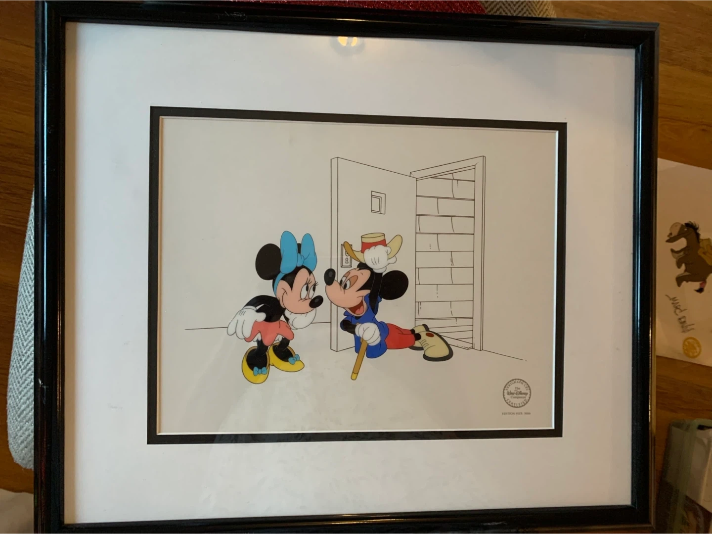 Selling a framed cel from Walt Disney Studios Animation Art, titled "Mickey's Surprise"! This piece is from a limited edition size of 5000. The glazing on this picture is plexiglass.
