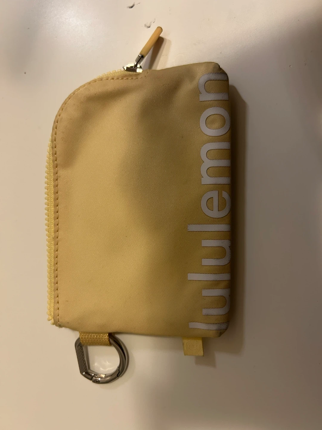 A cute Lululemon pouch for your coins and cards! It's a sunny yellow colour and in great condition. Perfect for keeping your essentials organized on the go