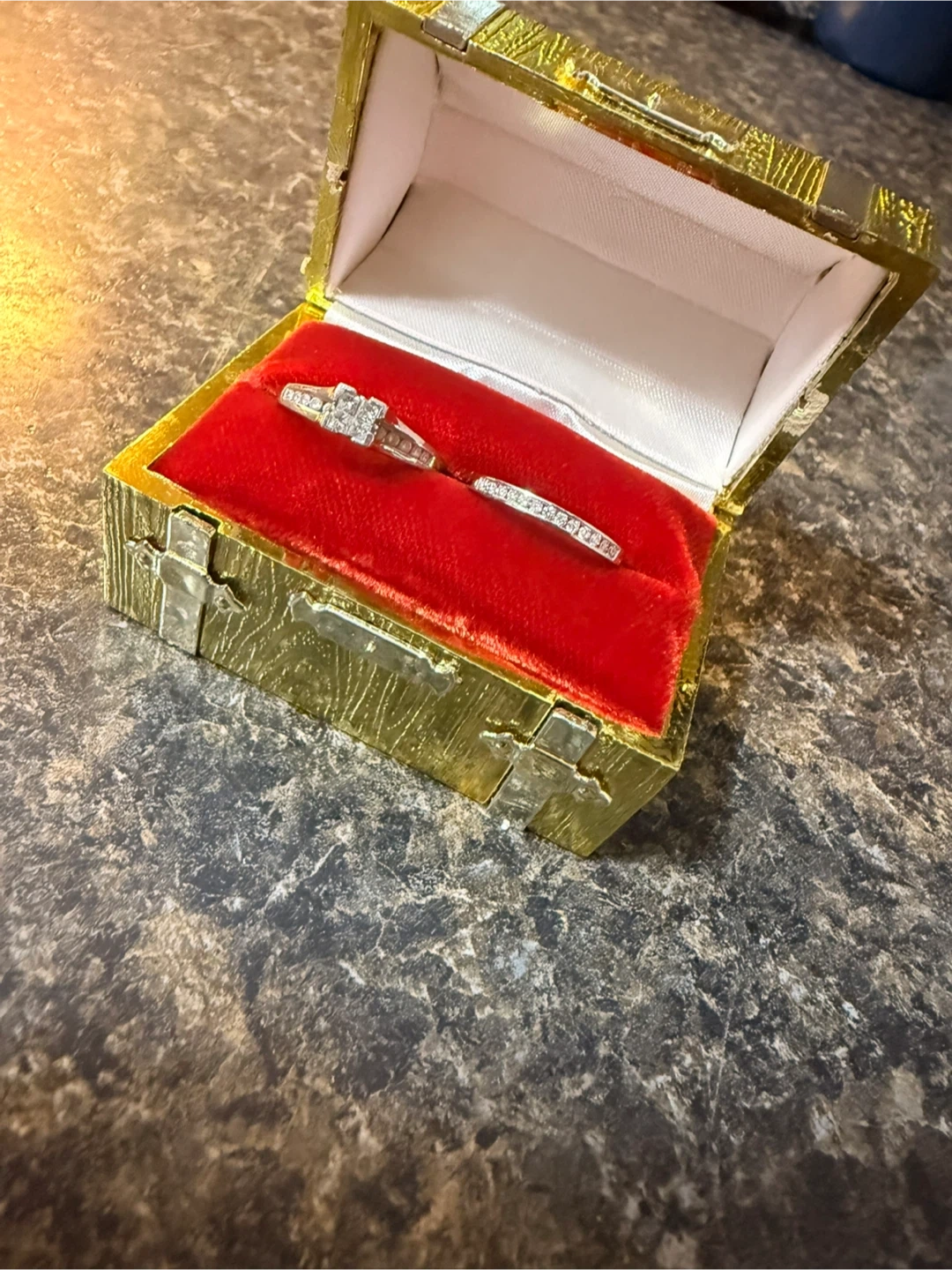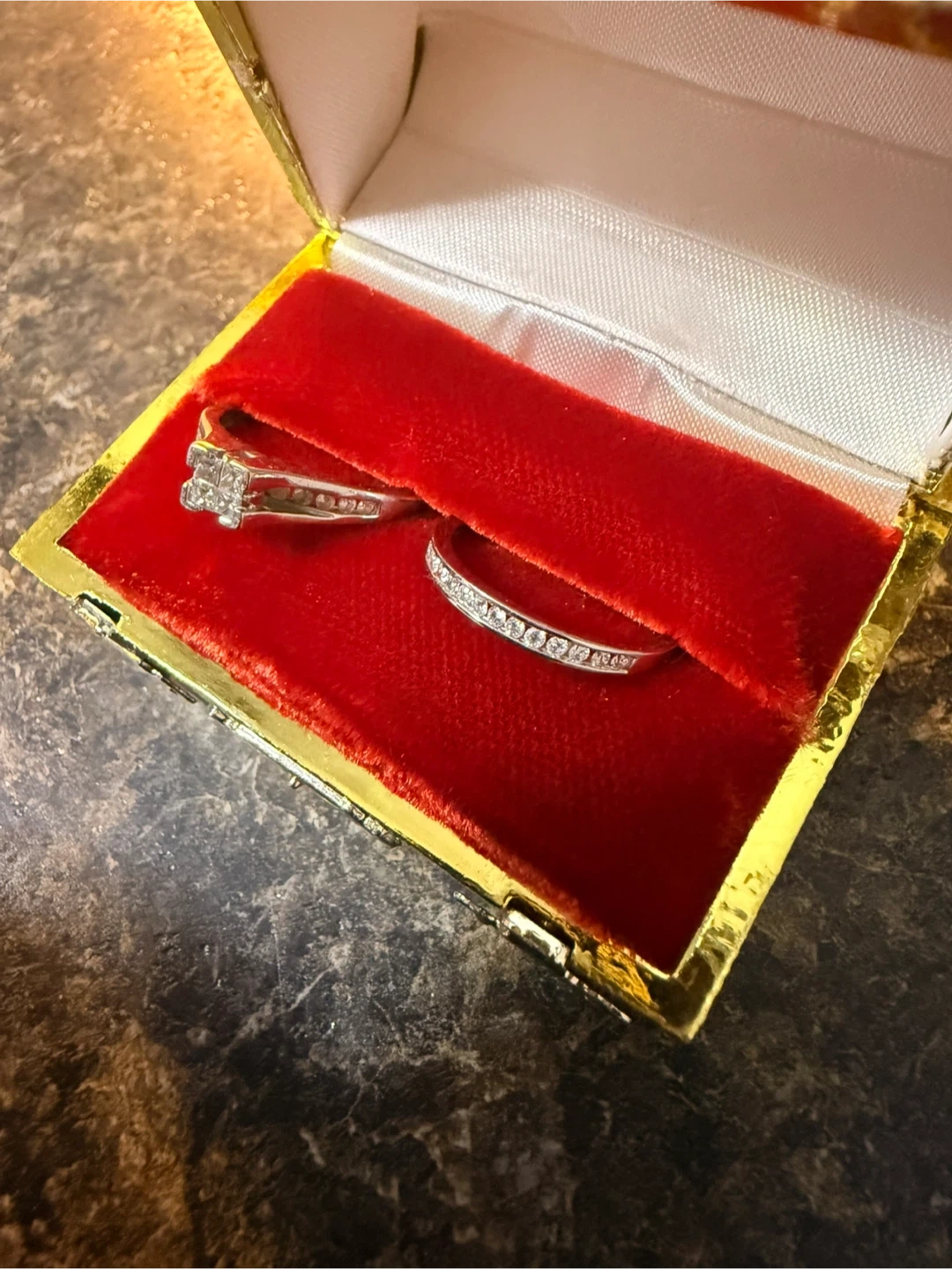 10k white gold engagement set. Size 5.5 1/2 karat in total. When the rings were sized the 10k was taken out but I have the receipt to show. Selling for $800.00.