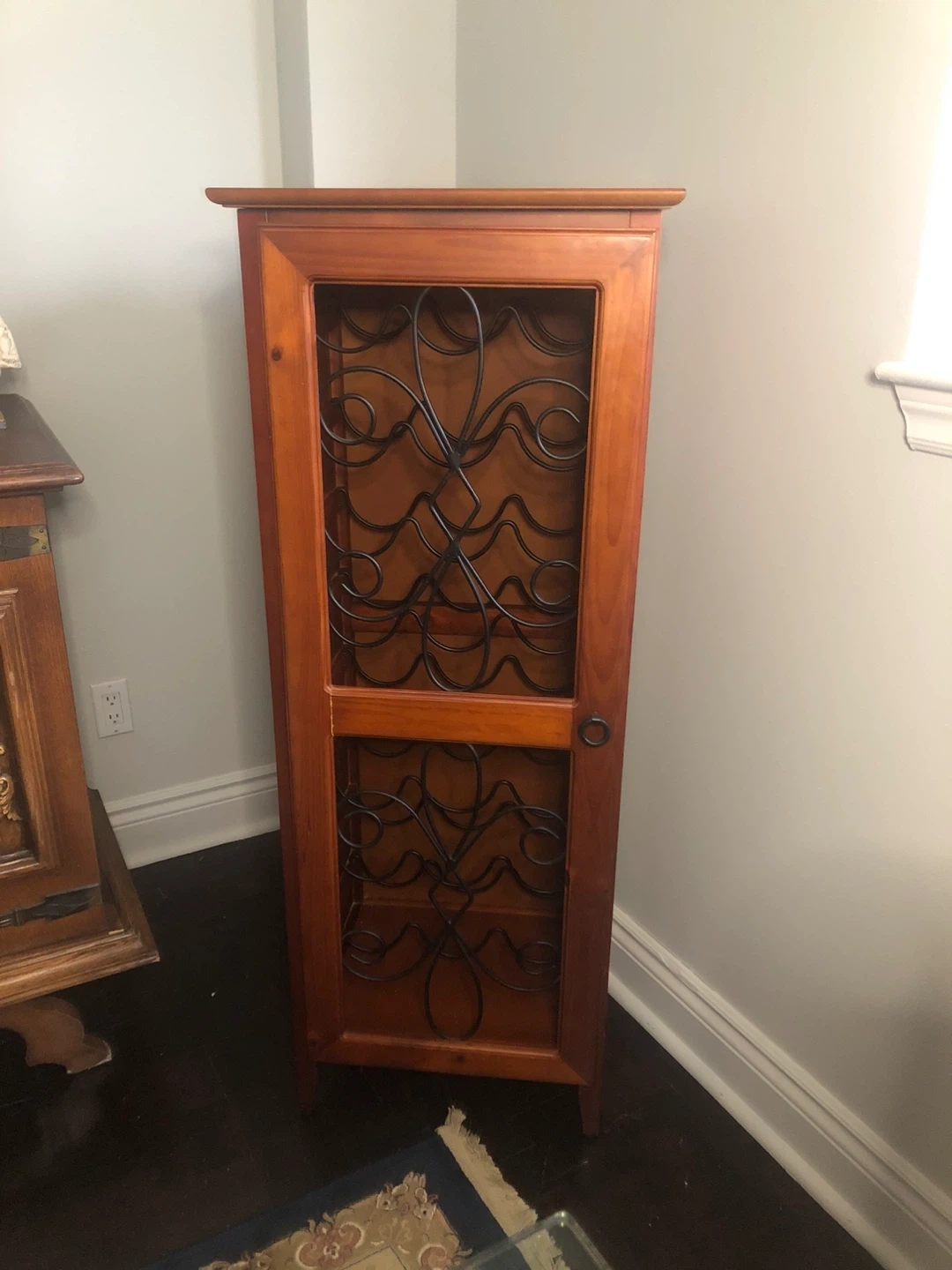 Selling a wooden wine cabinet. It's in good condition and has a decorative metal wine rack inside. Perfect for storing your favourite bottles!Holds 48 bottles.