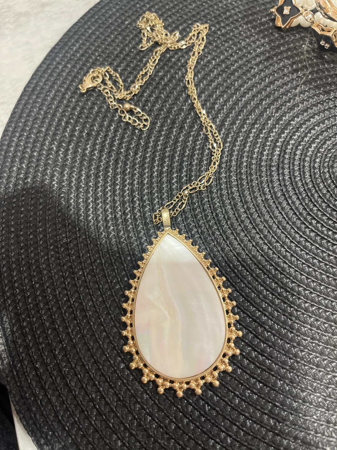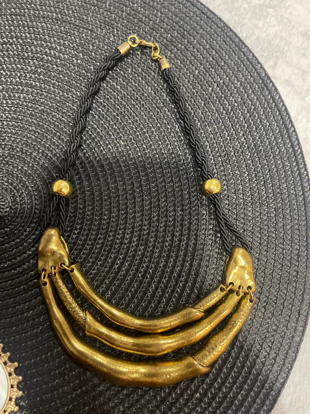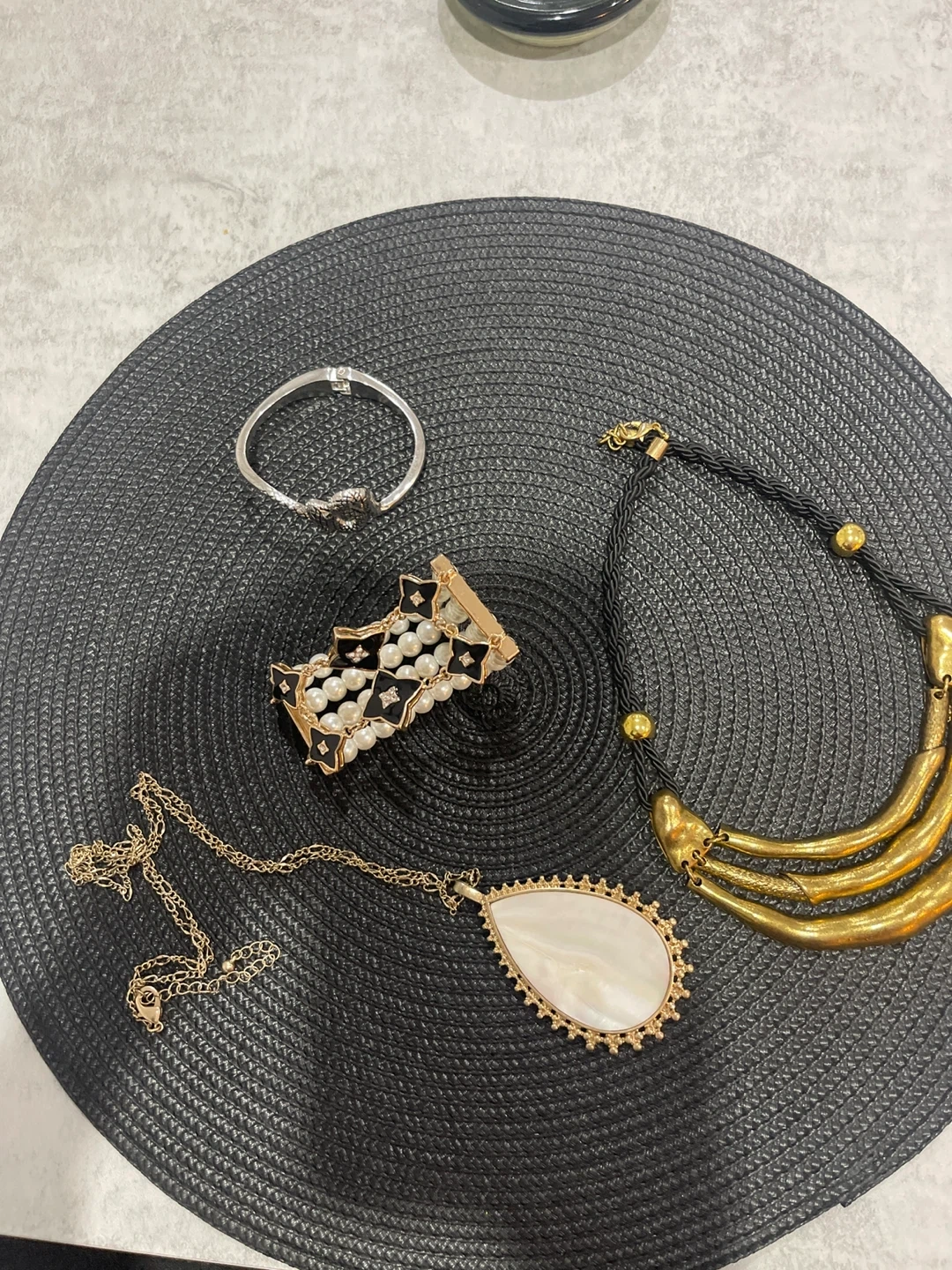 Selling a collection of necklaces and a bracelet. There is a gold-tone necklace with a white pendant, a gold-tone necklace with a black rope and gold accents, a silver snake ring, and a gold-tone bracelet with a pearl and black quatrefoil design