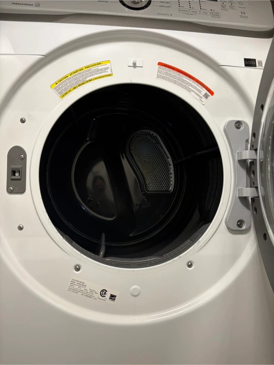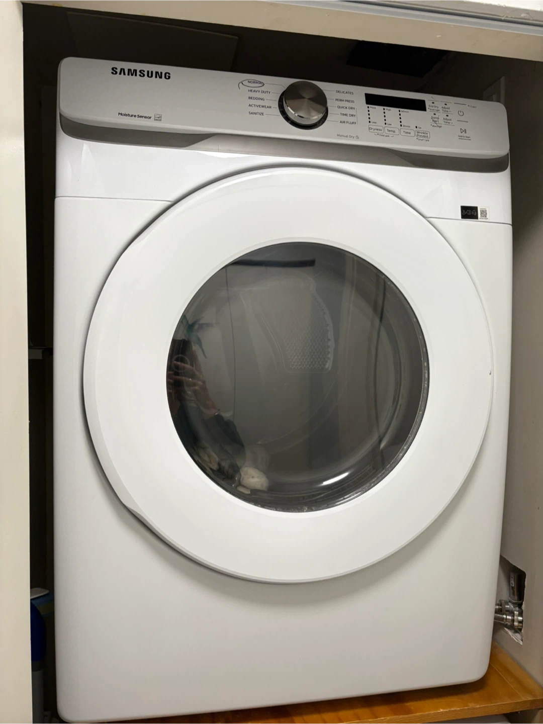 Selling a Samsung clothes dryer, model number DVE45T6005W. It's in great working condition and ready for a new home. It operates at 120/240V and 5400W. The dimensions are approximately 27" W x 31.5" D x 38.7" H.