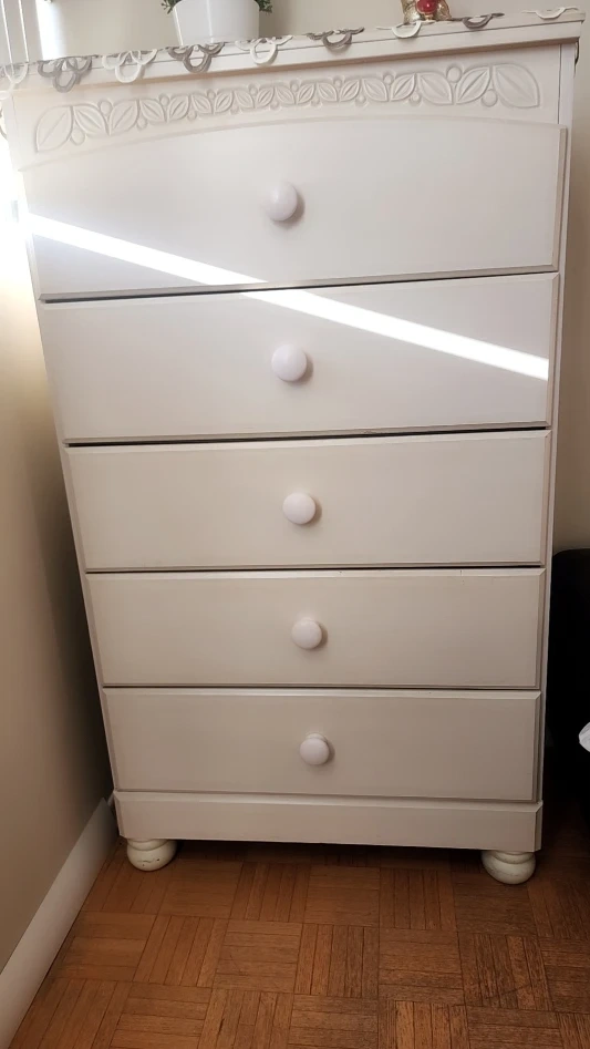 Selling a white dresser with five drawers. It has a classic design with round knobs and decorative detailing on the top. Perfect for adding storage to any bedroom!