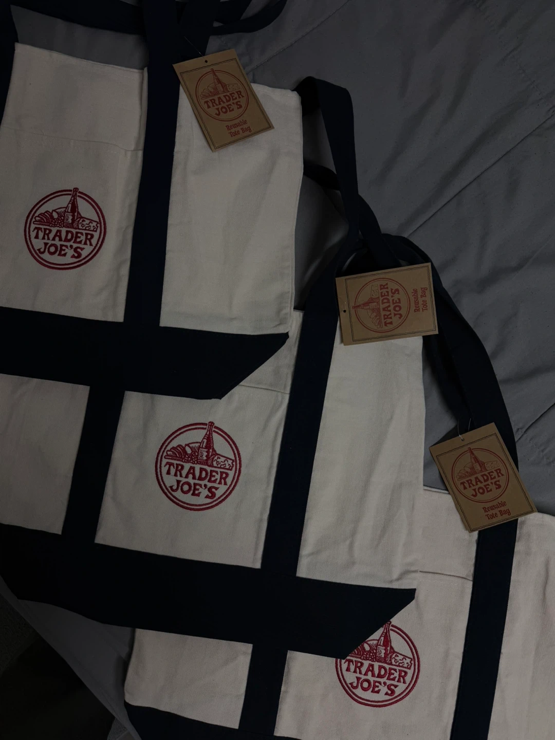 I have a Trader Joe's reusable tote bag for sale! It's brand new with tags and ready for your next grocery run. This sturdy tote is perfect for carrying all your favourite Trader Joe's finds