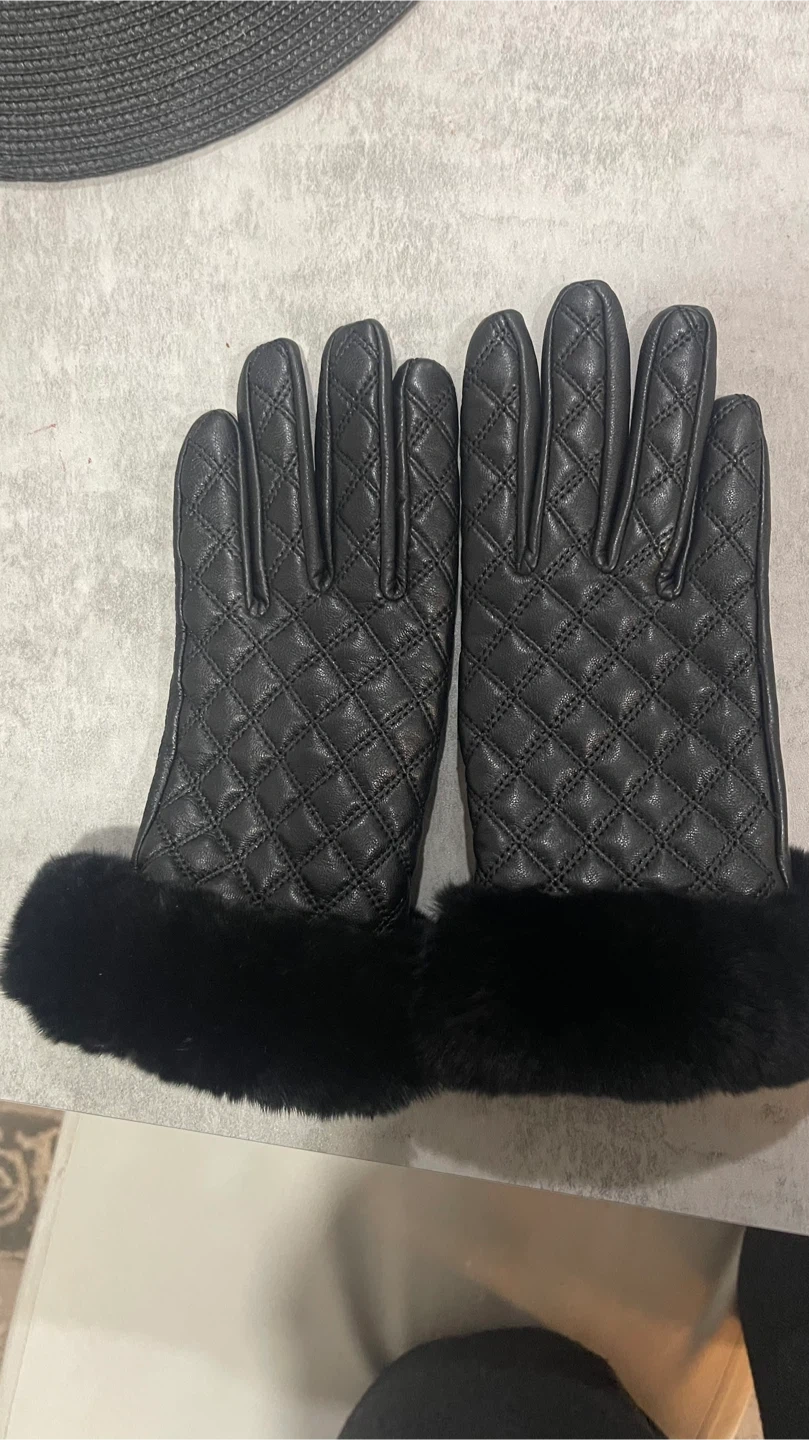 Selling a pair of frr black leather gloves in size L. These gloves feature dyed rex rabbit and dyed sheepskin. The fur origin is Spain, and they were designed in Canada and made in China. They are in great condition and ready to keep you warm!
