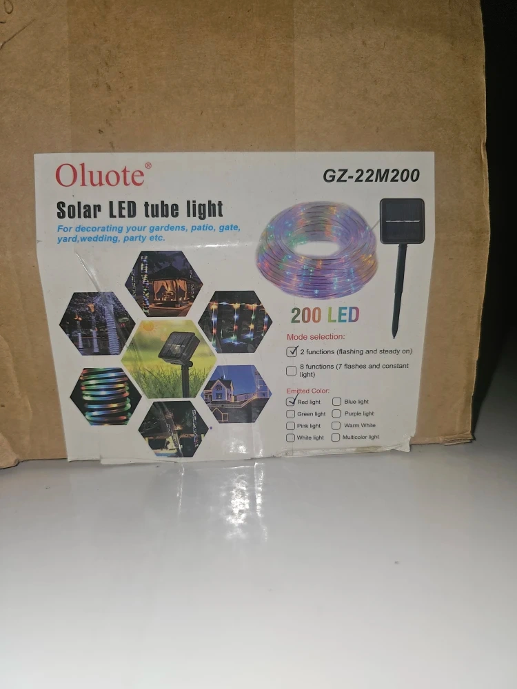 I'm selling an Oluote Solar LED tube light. It's perfect for decorating your gardens, patio, gate, yard, wedding, and parties! This light has 200 LEDs and comes with 2 functions (flashing and steady on) and 8 functions (7 flashes and constant light). The emitted colour is red light. Let me know if you're interested!
