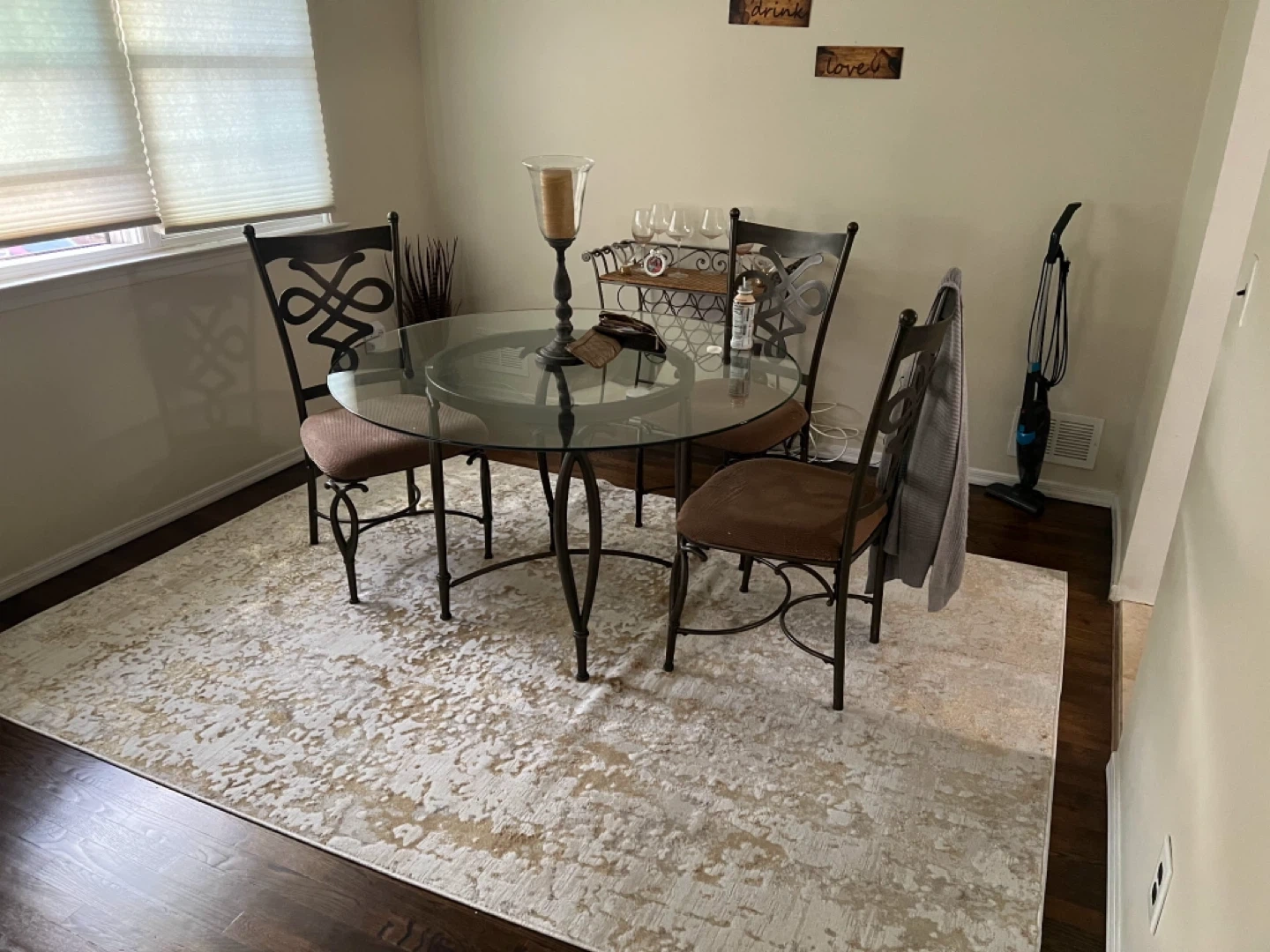 Selling a dining table with four chairs! The table has a glass top and metal legs. The chairs have a metal frame with padded seats. They're in good condition and ready for a new home