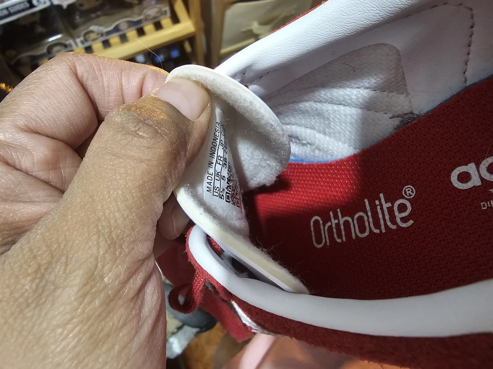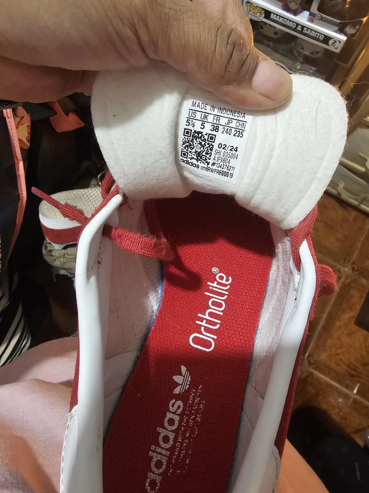 Selling a pair of Adidas Gazelle sneakers in red with white stripes! They are a women's size 5.5 US, 38 EUR, and 240mm. The insole features Ortholite technology for added comfort. These shoes are in used condition, but still have a lot of life left!