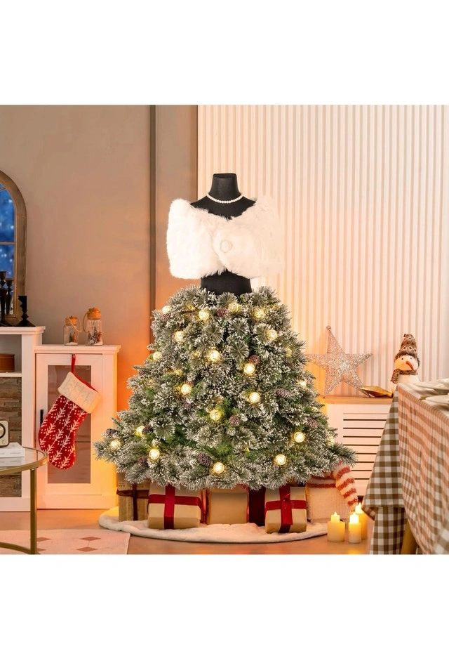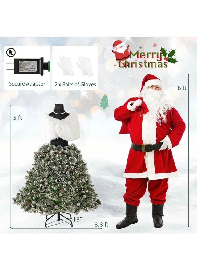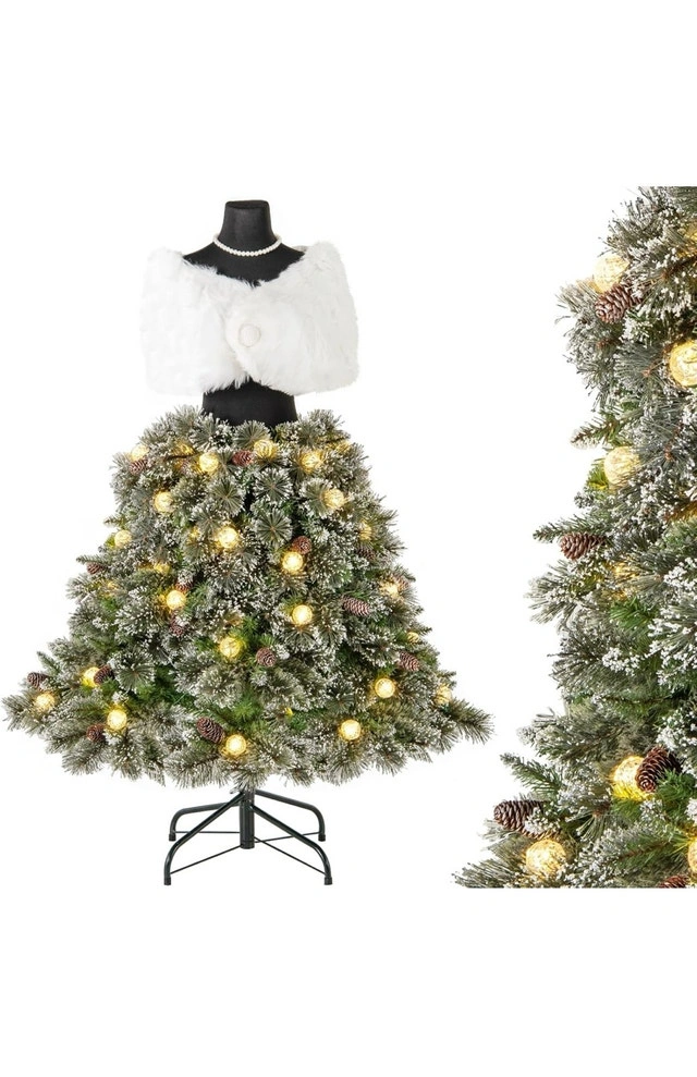 Great Christmas tree for your: clothing boutique, fashion shop, studio. 5ft Dress-Form Christmas Tree with necklace, plush shawl, and elegant branch skirt 465 PVC tips – fireproof, non-allergenic, no smell 50 warm white LED lights in diamond-style flower shells Lush look with glitter pine needles, PVC leaves & 36 pine cones Easy assembly – hinged branches, sturdy metal stand, gloves included Original price is $250 Now: 190