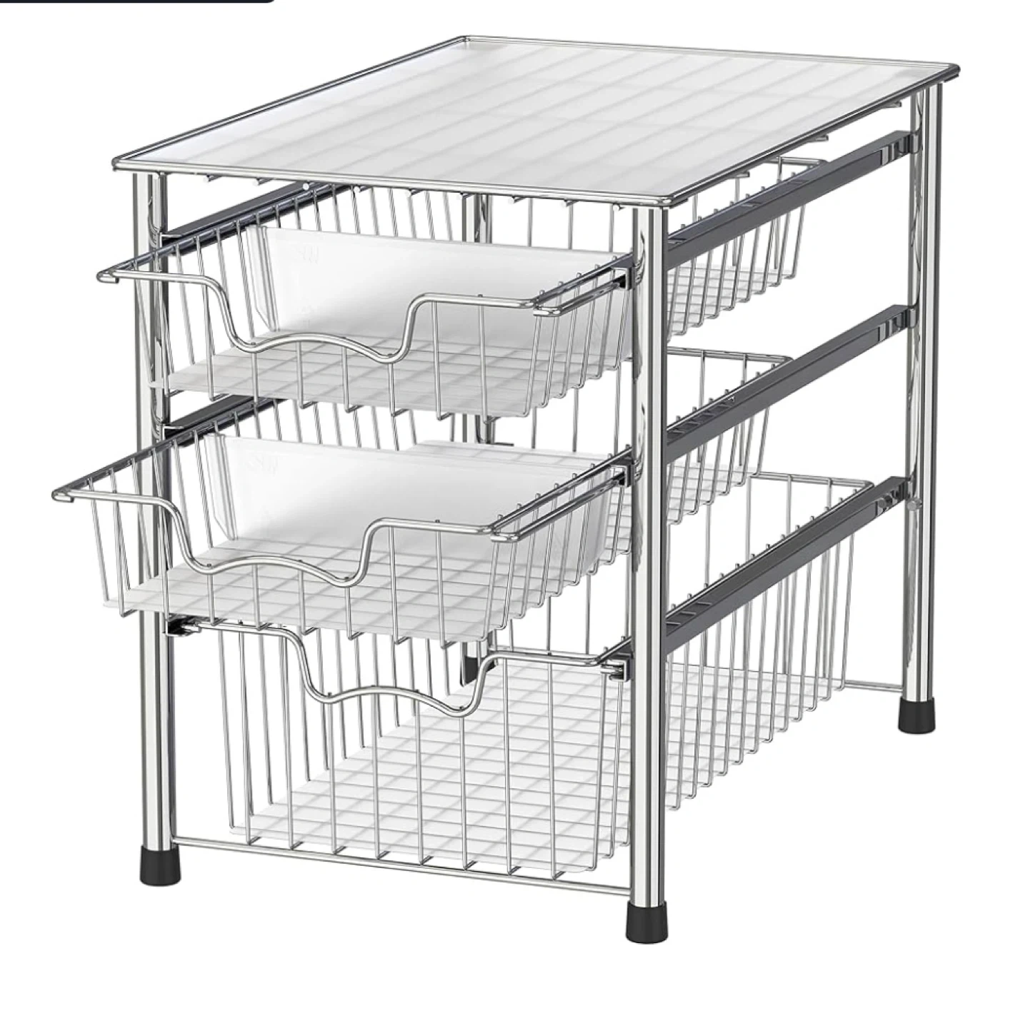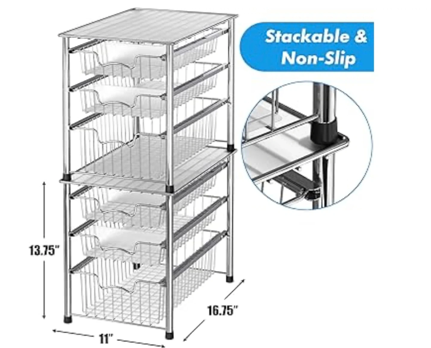 Declutter your space with this handy under-sink organizer! It features pull-out baskets for easy access and a stackable, non-slip design. The dimensions are approximately 11" wide x 16.75" deep x 13.75" high, making it a great fit for under sinks or in other tight spaces