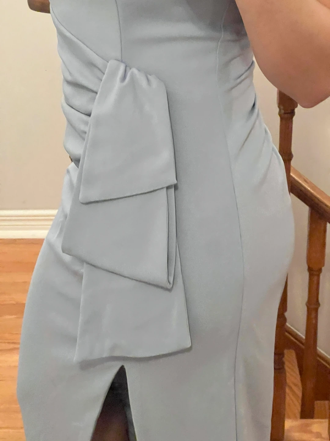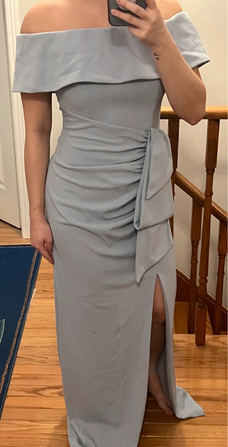 Selling a beautiful light blue off-shoulder gown (has grips so sleeves don’t slip) in size 6! It features a stylish bow detail that covers the stomach so it’s a flattering silhouette. Original value $348.00, this gown is perfect for a special occasion/gala