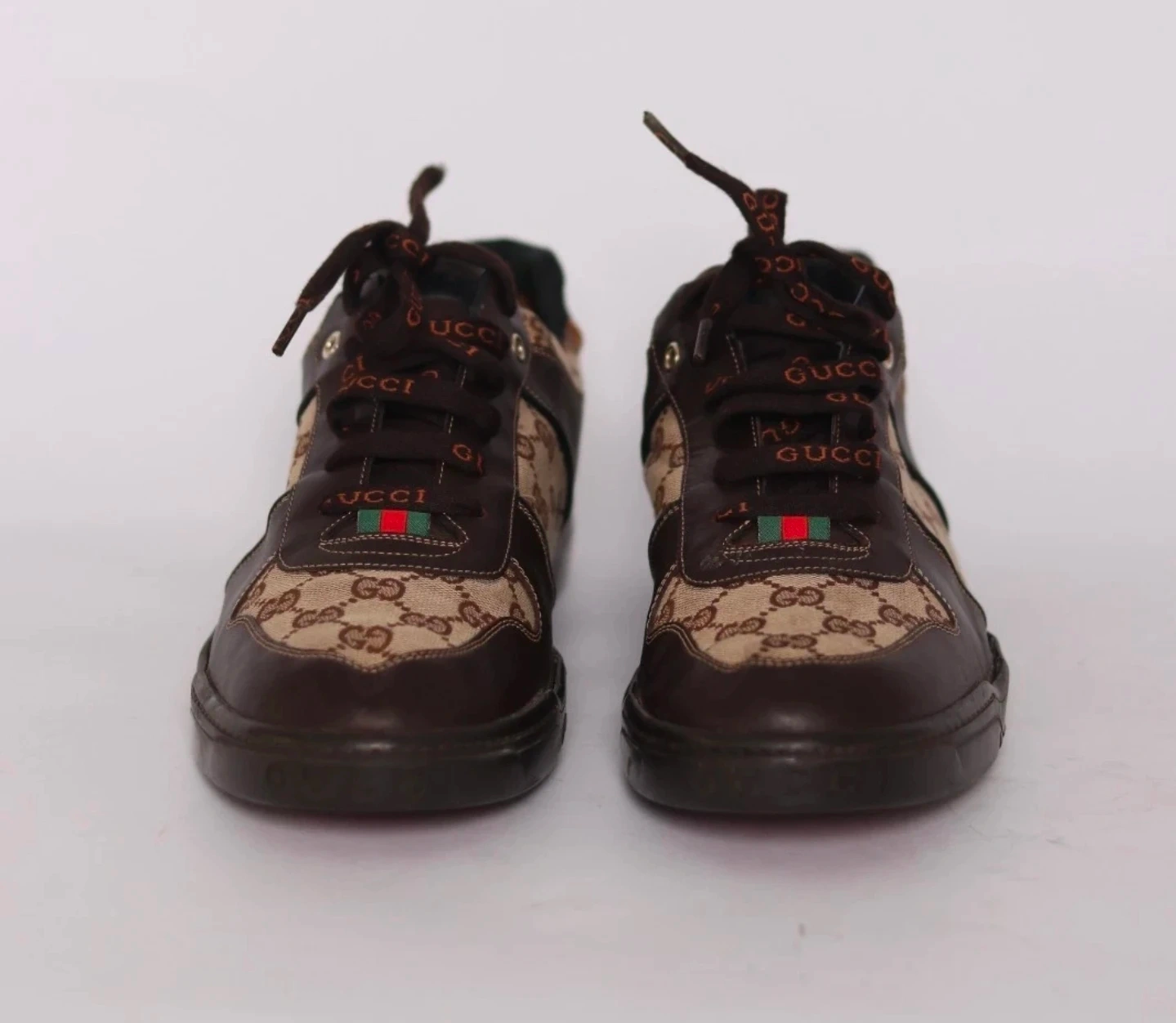 Selling a pair of Gucci sneakers in brown. They feature the iconic Gucci monogram pattern on the sides and laces. Great for adding a touch of luxury to your casual outfits!