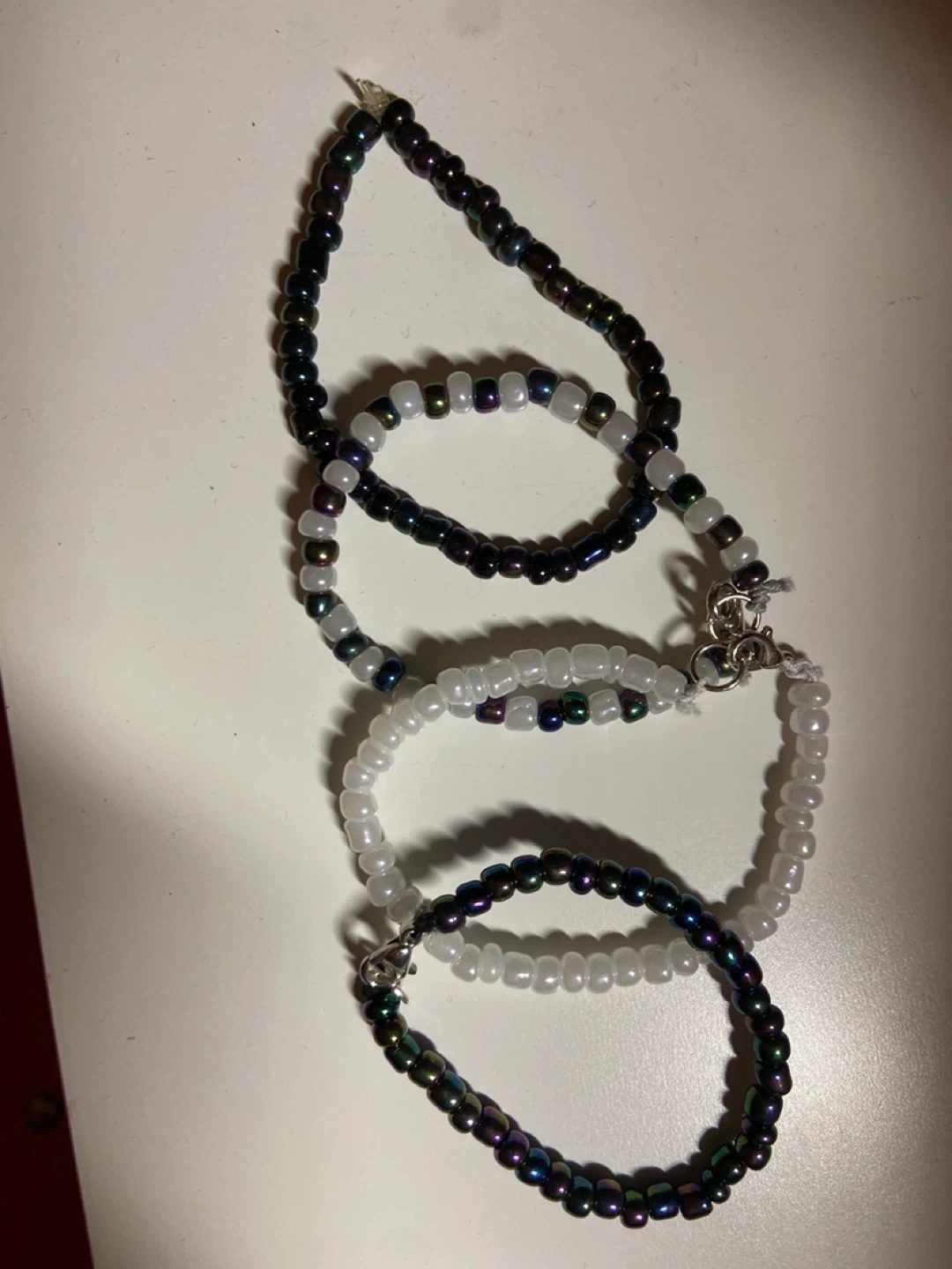 Selling a set of three handmade beaded bracelets. They feature a mix of iridescent black and white beads and are secured with a clasp. Perfect for adding a unique touch to your outfit!