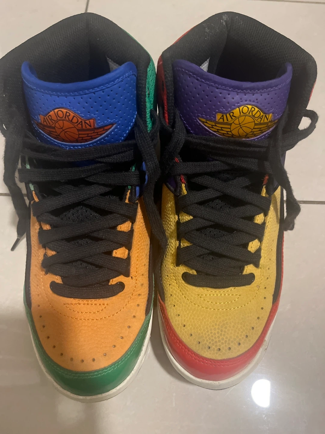 Selling a pair of Jordan 2 Retro sneakers in a vibrant multi-color design! These are a women's size US 9, which fits a men's 7.5. They're in good condition and ready for a new home
