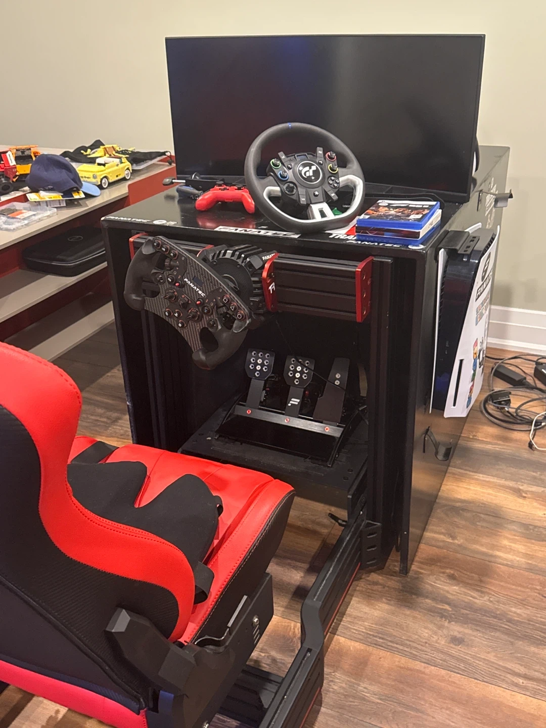 Selling a complete racing simulator setup. Includes a racing seat, steering wheel, pedals, and a monitor. Perfect for racing enthusiasts looking for an immersive experience
