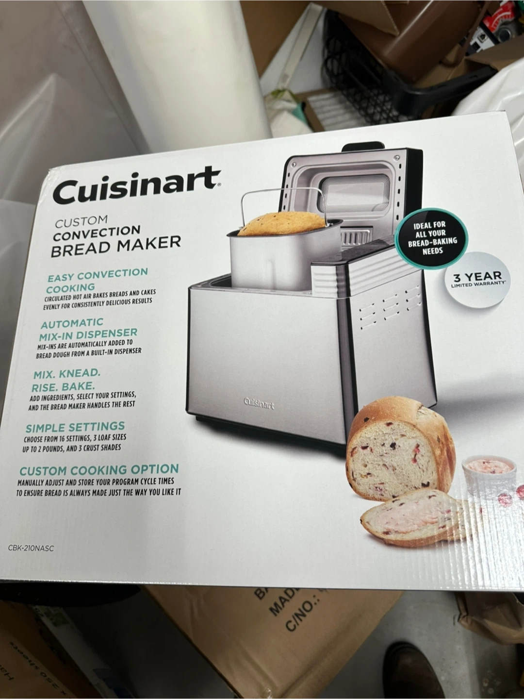 Selling a brand new Cuisinart Custom Convection Bread Maker! It features easy convection cooking, automatically adds mix-ins, and has custom cooking options. It also has simple settings to help you rise, knead, and bake with ease. The box is included!