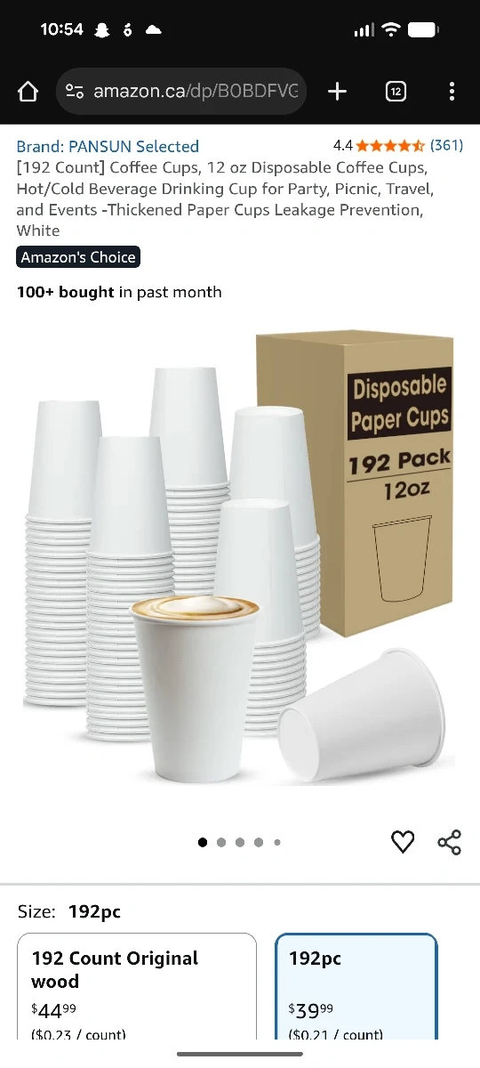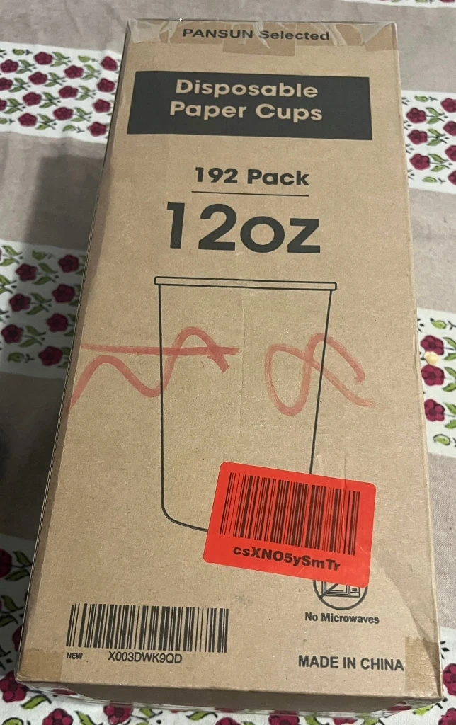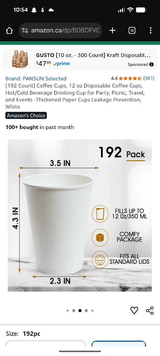 Selling a pack of PANSUN Selected disposable paper cups. They come in a pack of 192 and each cup is 12oz. These cups are great for hot or cold beverages, perfect for parties, picnics, travel, and events. They're designed with thickened paper for leakage prevention. The cups measure 3.5 inches in diameter and 4.3 inches in height.