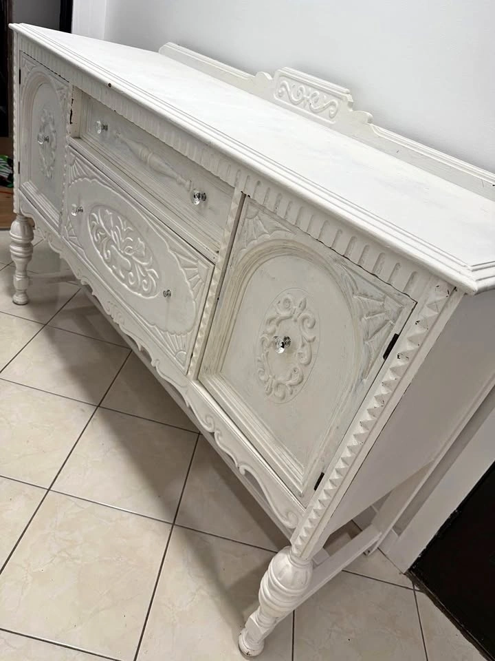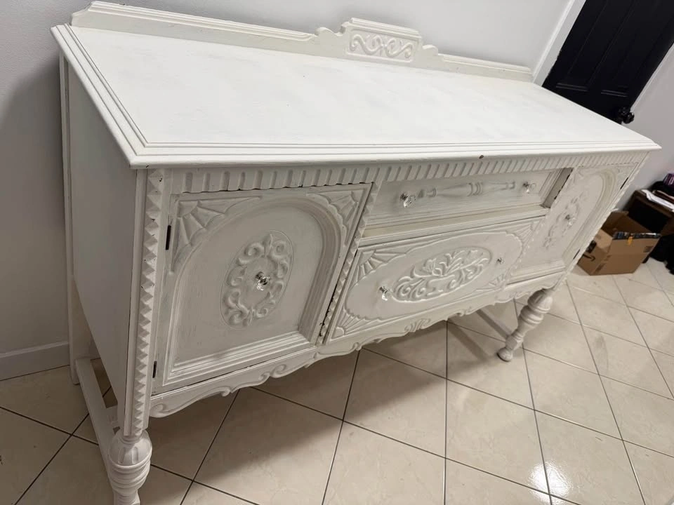 Beautiful solid-wood vintage sideboard painted in antique white. Gorgeous carved details and crystal-style knobs. Perfect as a buffet, coffee bar, or entryway piece. Doesn’t fit well in my space unfortunately.