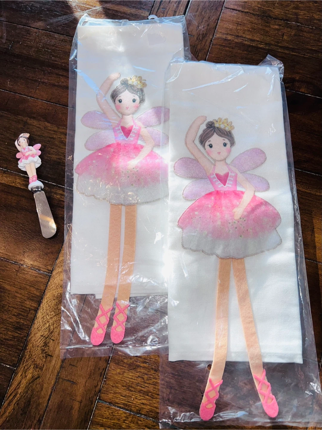 Cute set of two decorative cloth towels featuring a ballet fairy girl design! Also includes a matching butter knife with a fairy figurine. Perfect for adding a touch of whimsy to your table setting or a child's party