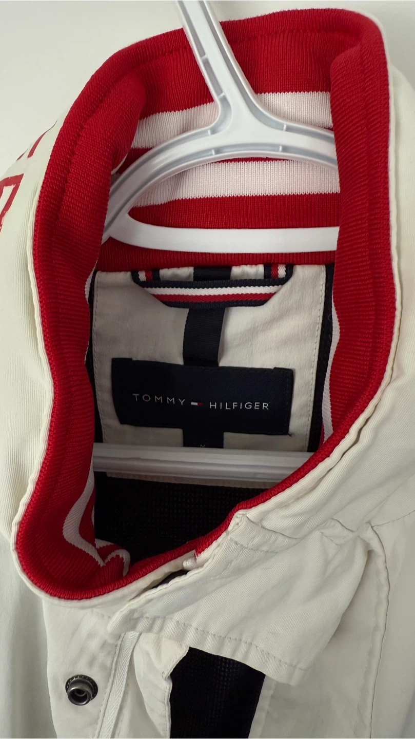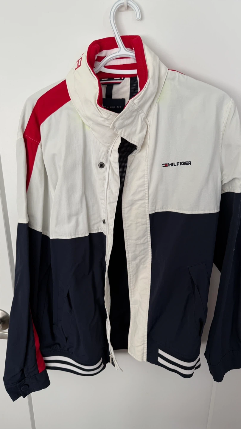 Here's a Tommy Hilfiger jacket in size medium! It features a stylish design with red, white, and navy blue. Perfect for adding a pop of colour to your wardrobe and staying warm!