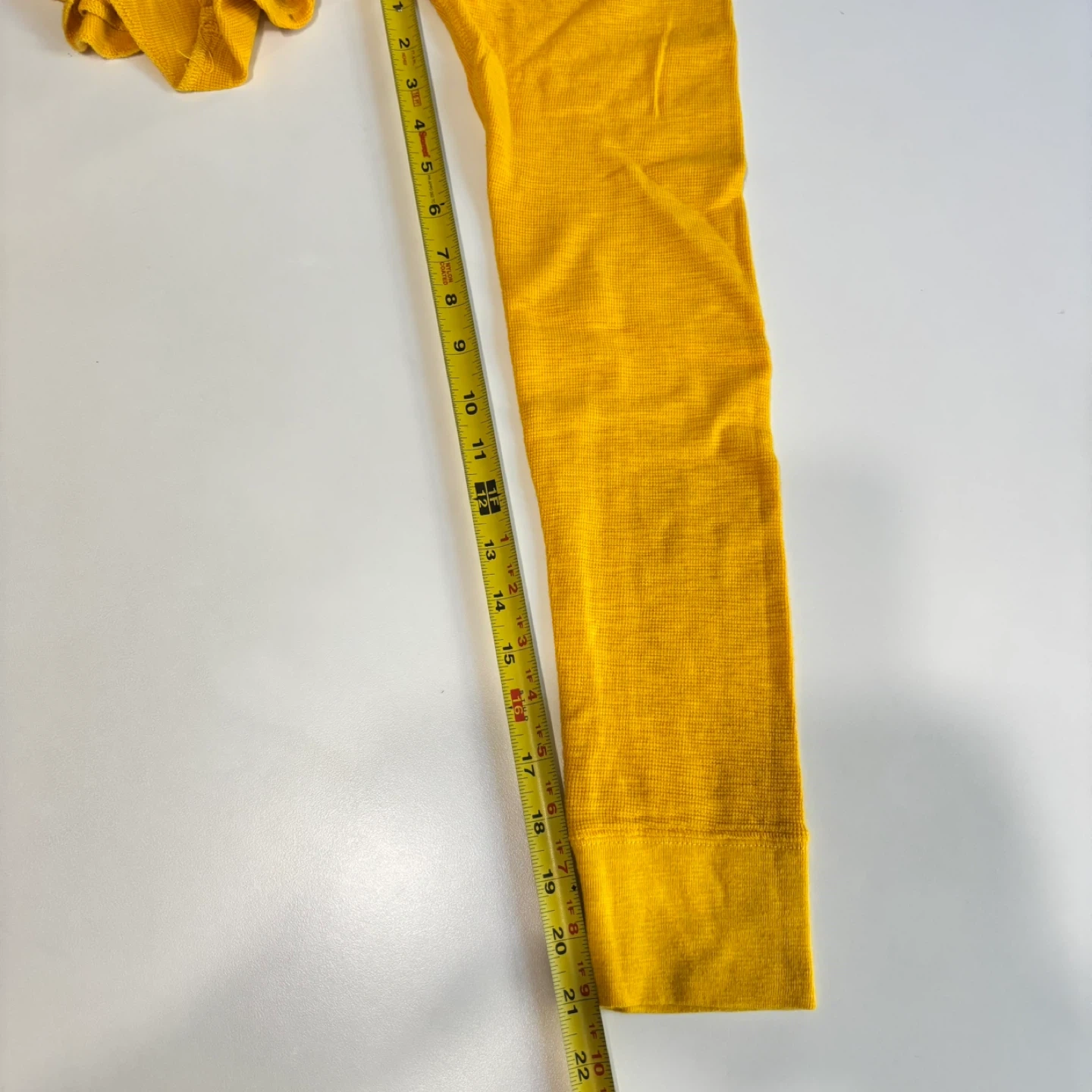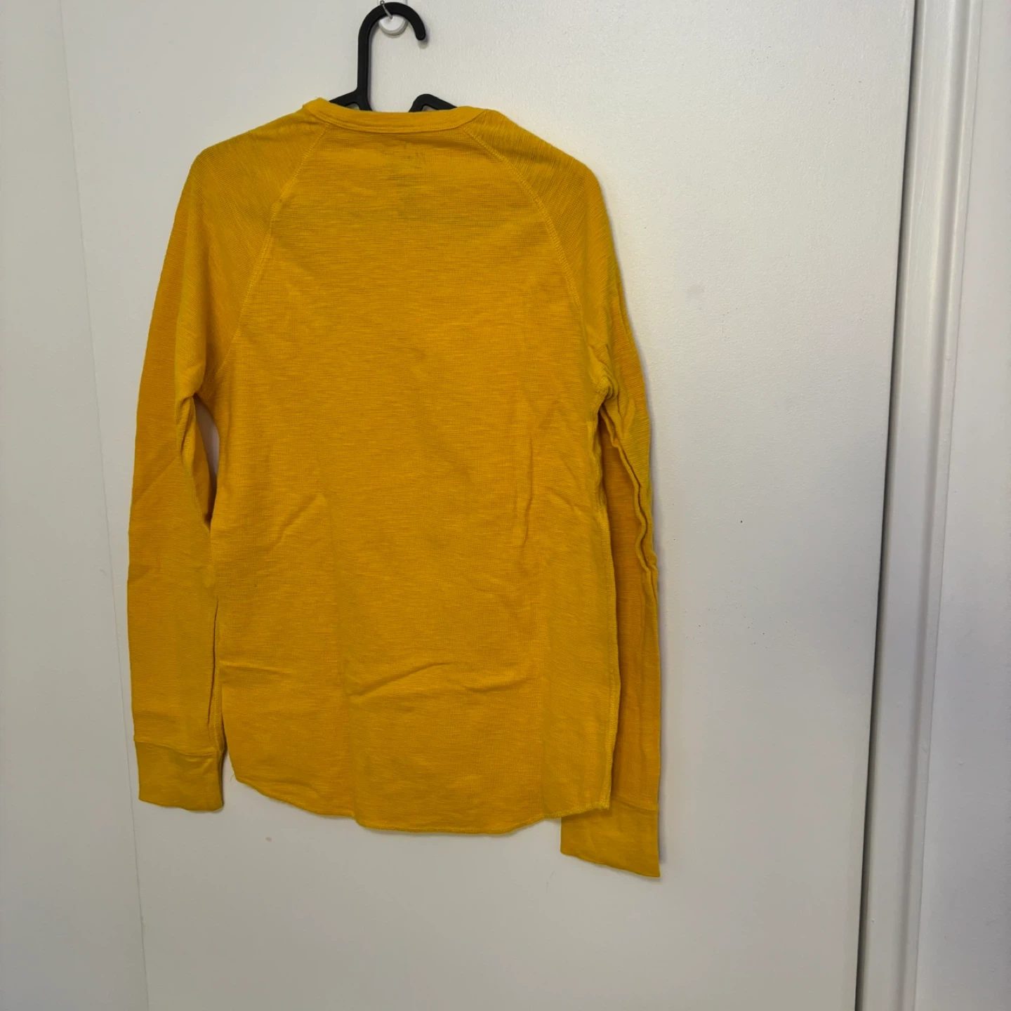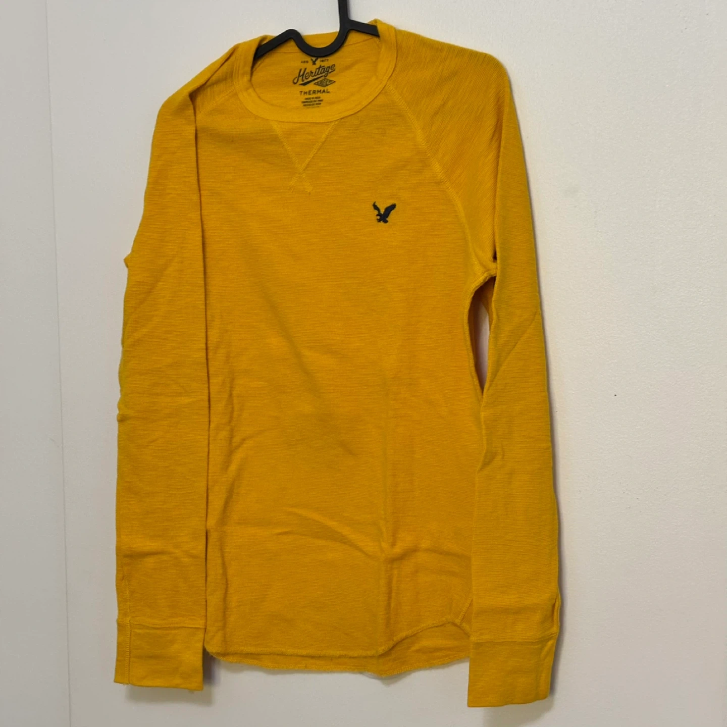 Selling an American Eagle Heritage thermal long sleeve shirt in size M. It's a classic fit and made of a comfortable thermal material. The shirt is a vibrant yellow colour, perfect for adding a pop of colour to your wardrobe!