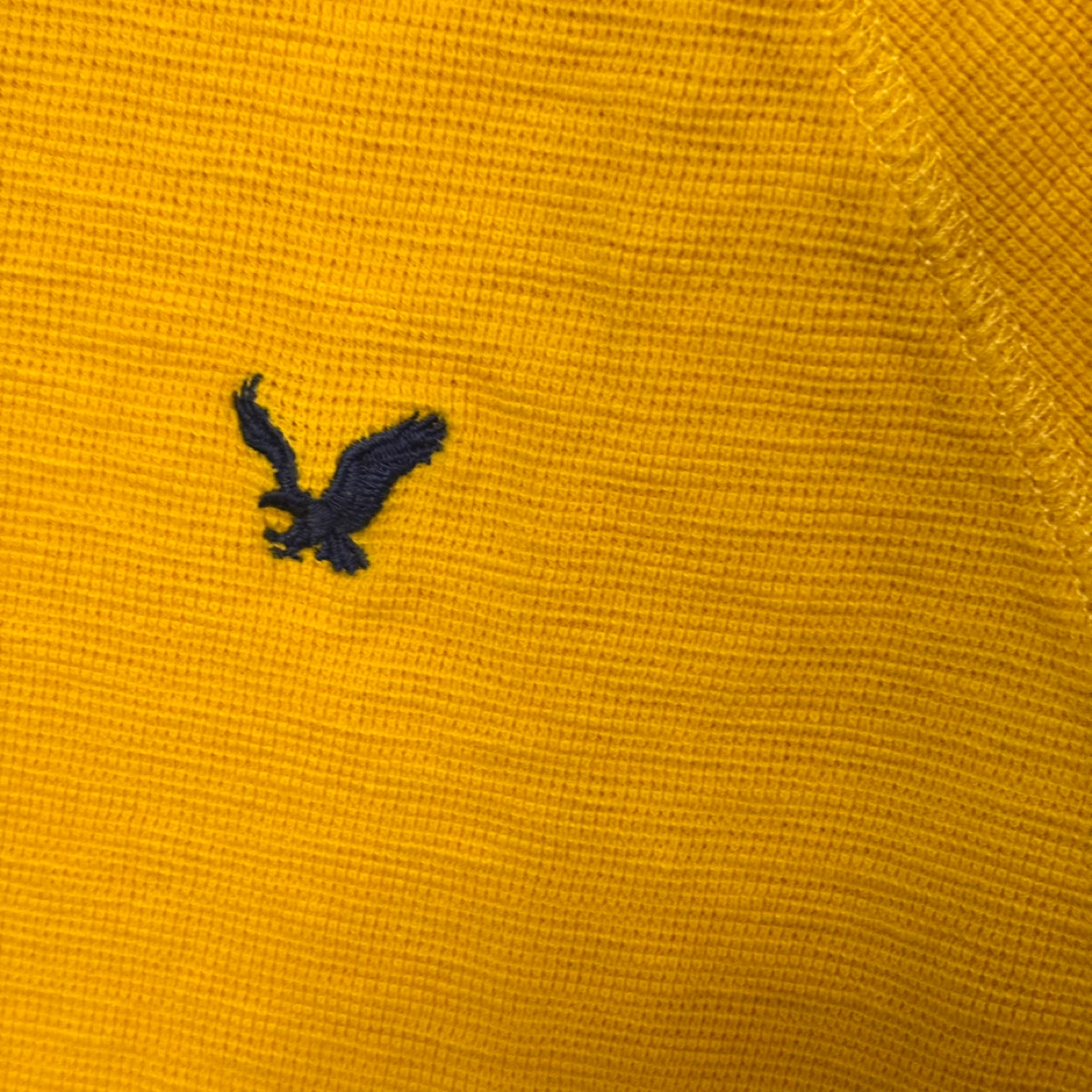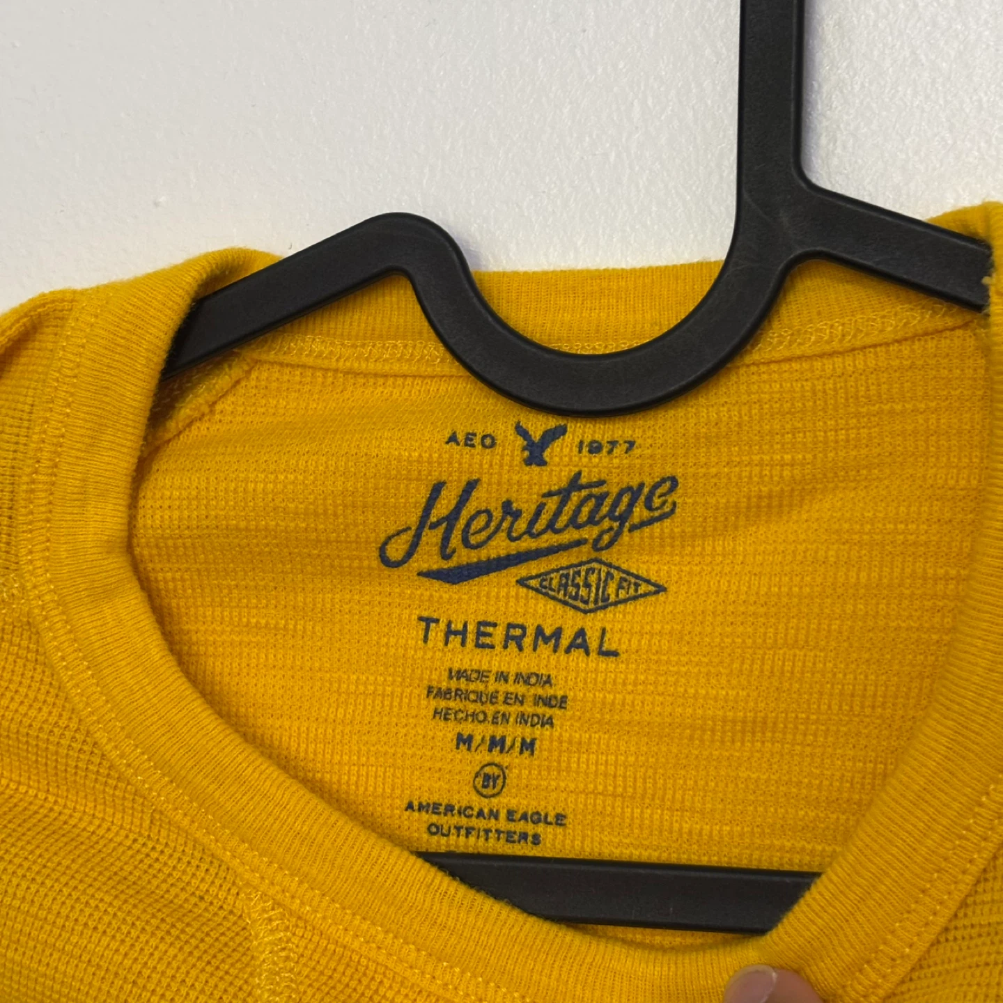 Selling an American Eagle Heritage thermal long sleeve shirt in size M. It's a classic fit and made of a comfortable thermal material. The shirt is a vibrant yellow colour, perfect for adding a pop of colour to your wardrobe!