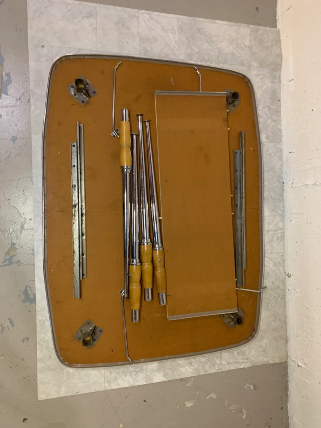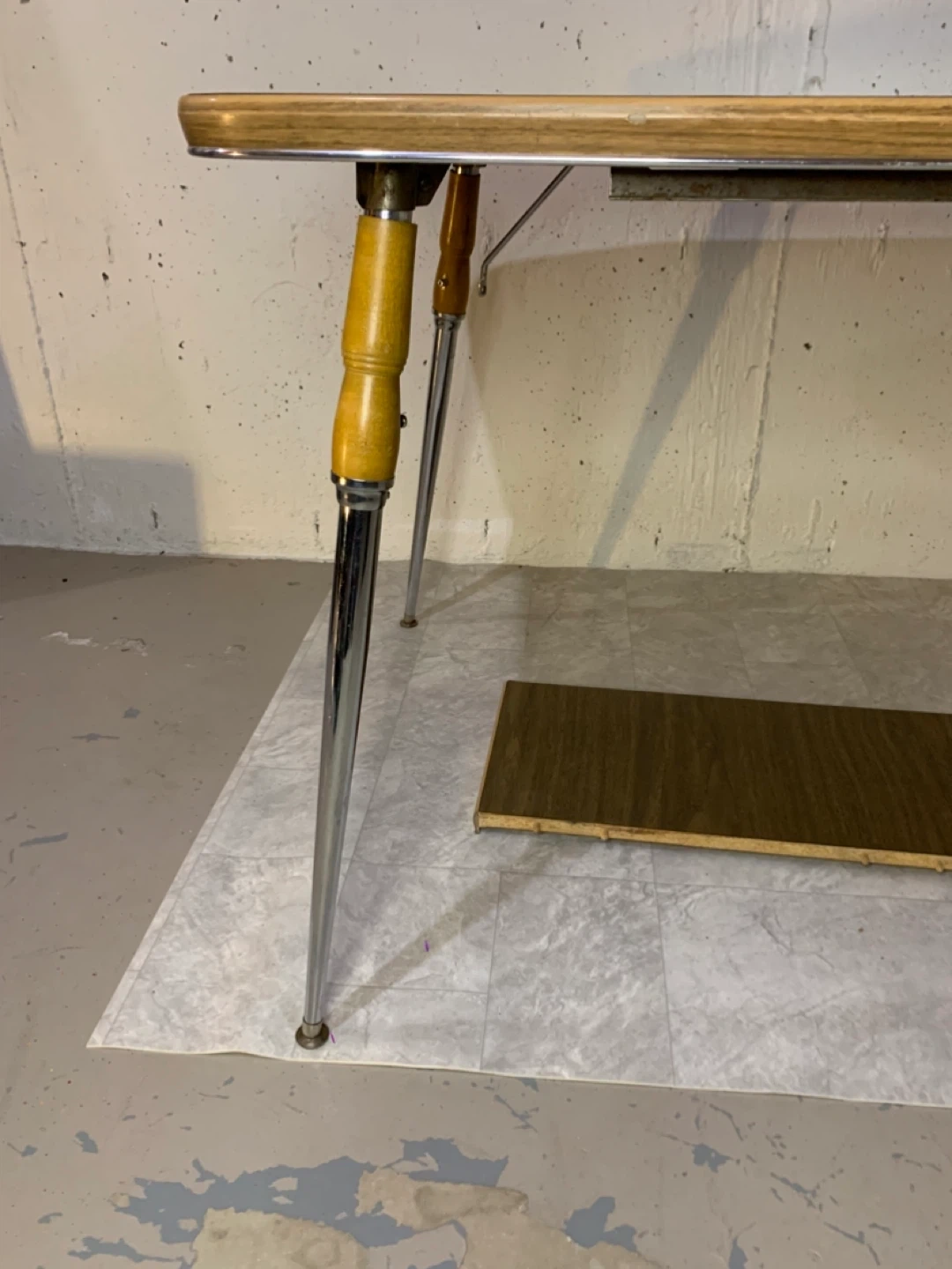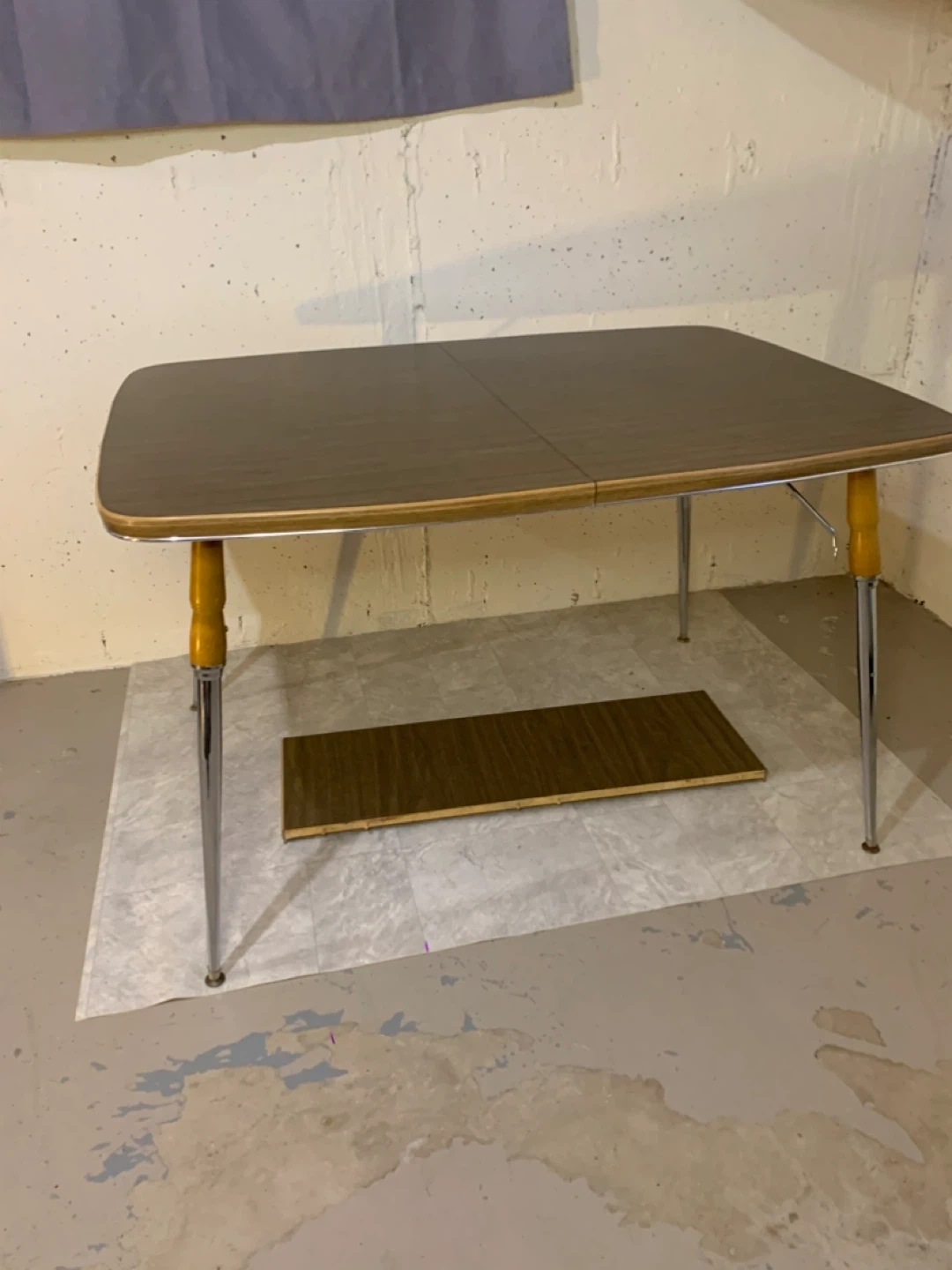 Selling a charming vintage dining table with an extendable leaf! It features a unique wood grain pattern and a convenient shelf underneath. Perfect for adding a touch of retro style to your dining area or kitchen