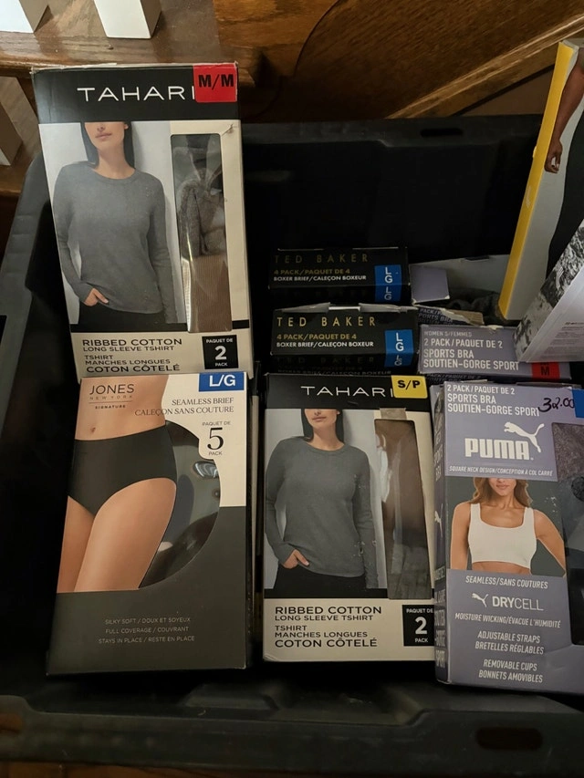 Selling 8-PACK Assorted Womens & Mens Boxed Clothing - Shirts, Under Garments. They are all new in the box. Boxes may be distressed. There are assorted sizes and brands. It's mostly women's, only a few items are men's. I have many more than 8 boxes, so this is a pick and choose, and you can take more than 8. I just have 8 set as the minimum due to time constraints.
