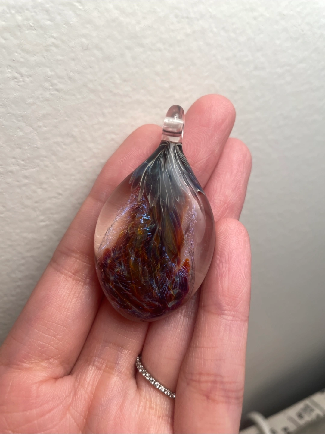 Unique hand blown glass pendant with beautiful colours and patterns inside the glass. Perfect for adding a touch of artistry to your style!
