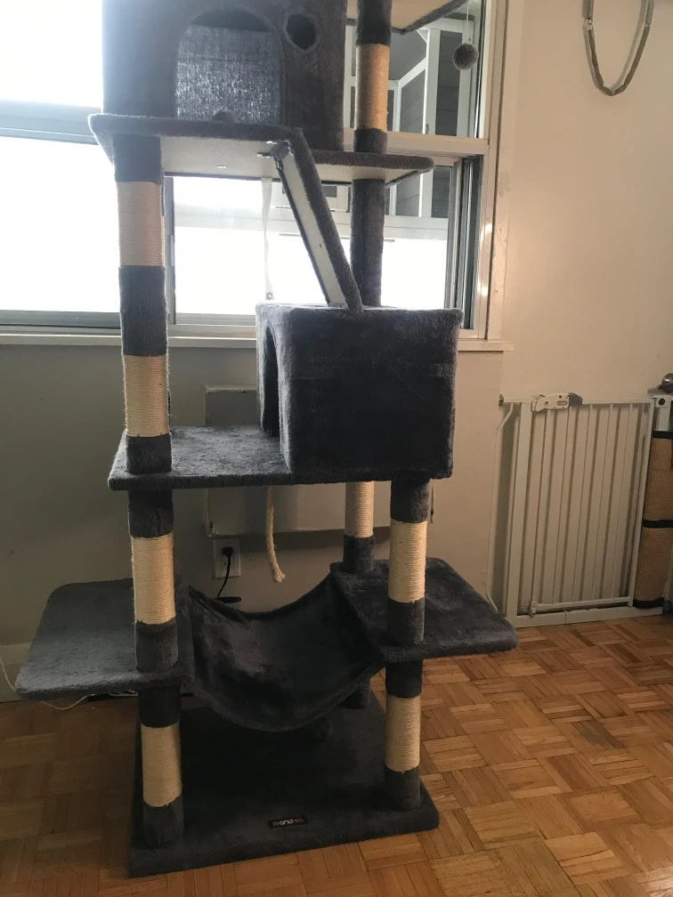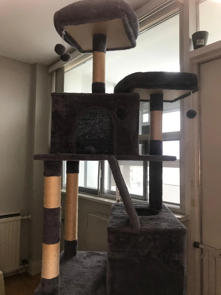 Selling a large cat tree in good condition! It features multiple levels for your cat to explore, play, and relax. It has scratching posts, a condo, and platforms. Your cat will love it!