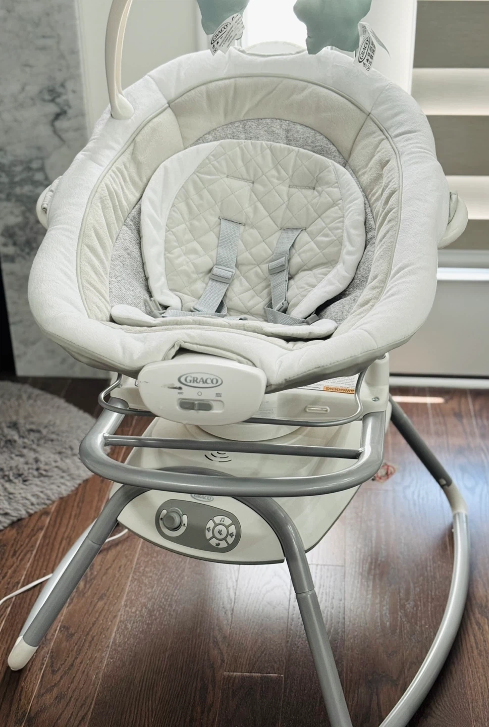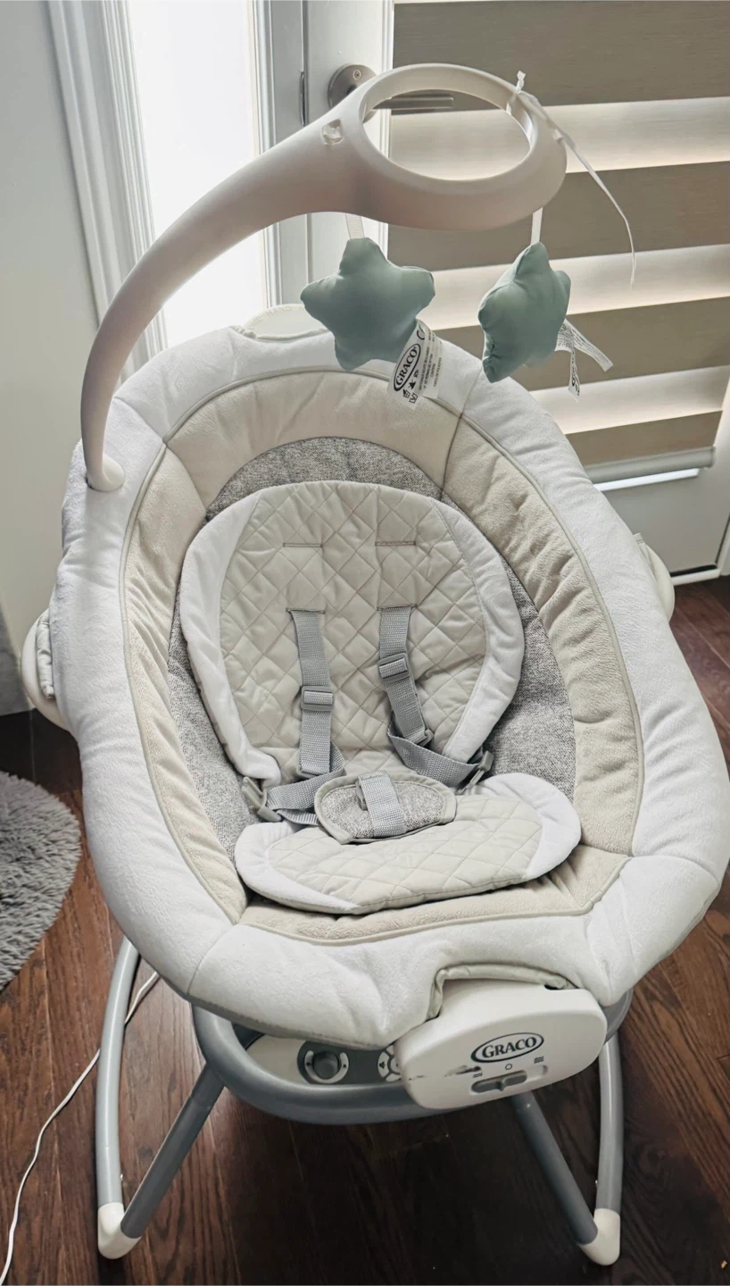Selling a gently used Graco baby swing. It's in great condition and ready for a new home! Perfect for soothing your little one with its gentle motion and cozy design