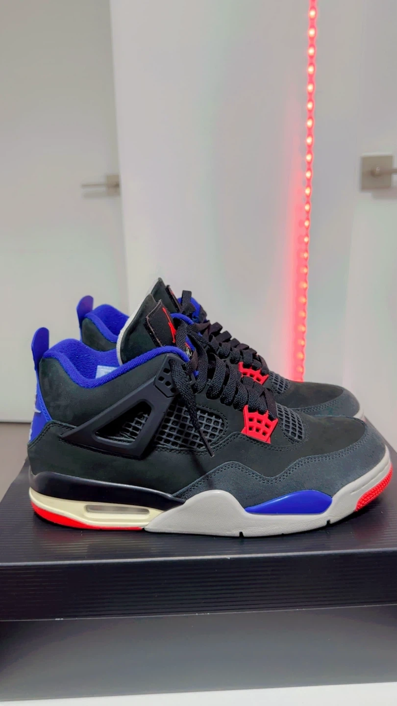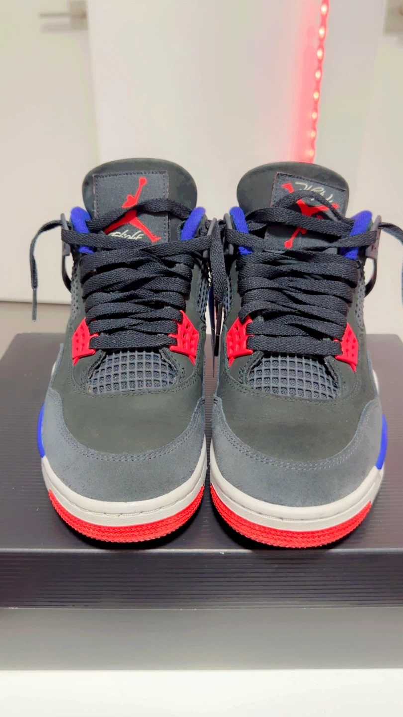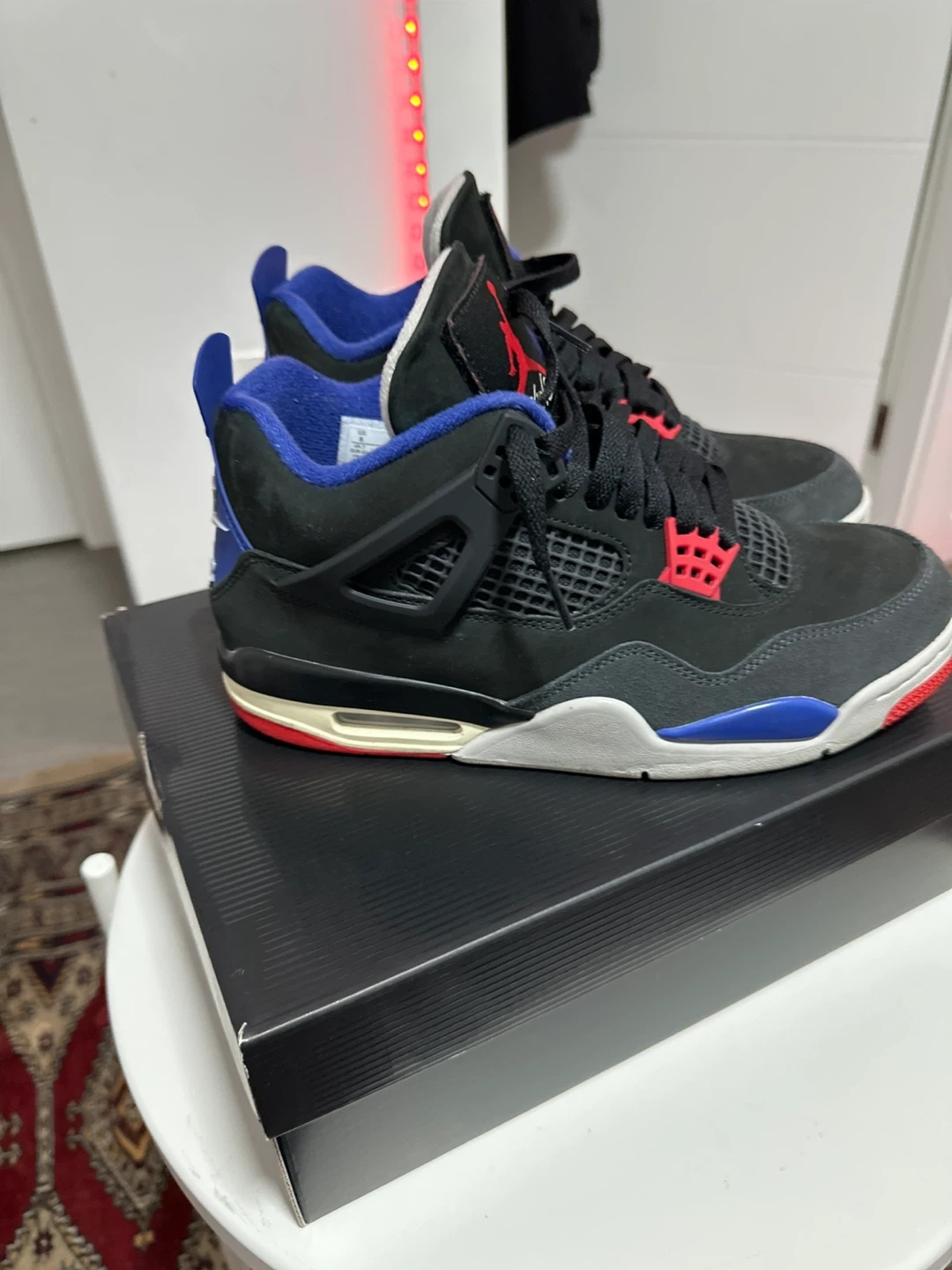 Selling a pair of Nike Air Jordan 4 Retro Royalty sneakers. They come with the original box and an extra pair of blue laces. I bought these shoes. On JD but it’s a little bit big on me I lost the receipt I wore them only a few times. They are brand new.