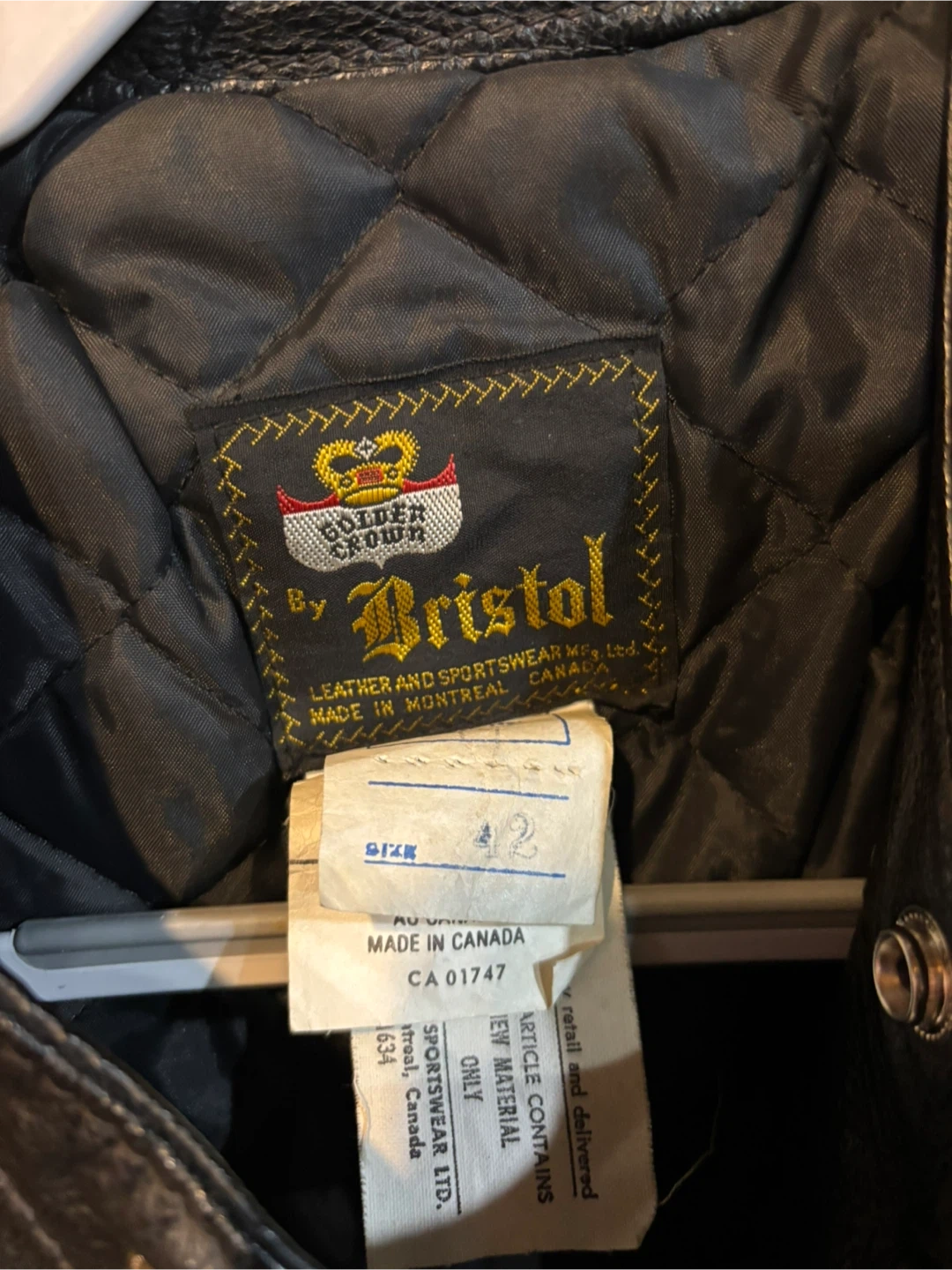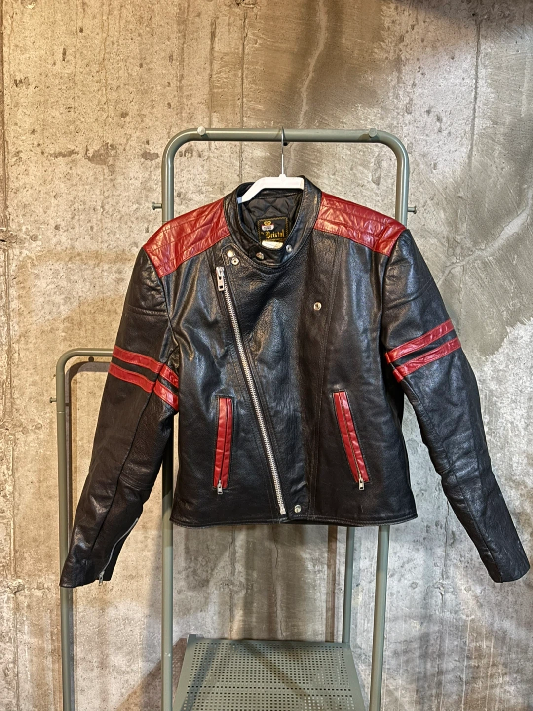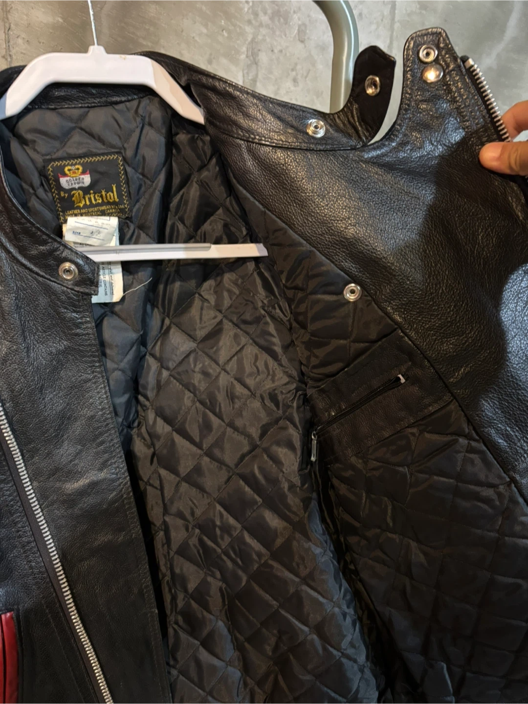 Selling a cool Vintage Bristol motorcycle jacket! It's black leather with red accents on the shoulders and arms. Great for riding or just looking stylish!