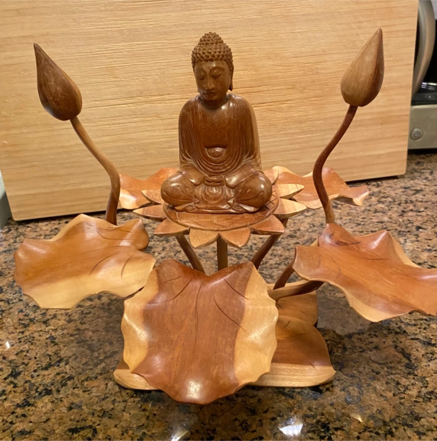 A beautiful wooden Buddha statue seated on a lotus flower stand from Bali. It's a unique piece that would add a touch of serenity to any space. All flowers, leaves and the Buddha are individual pieces that can be disassembled easily for storage. The craftsmanship is lovely, with detailed carvings throughout. It's in great condition and ready for a new home.