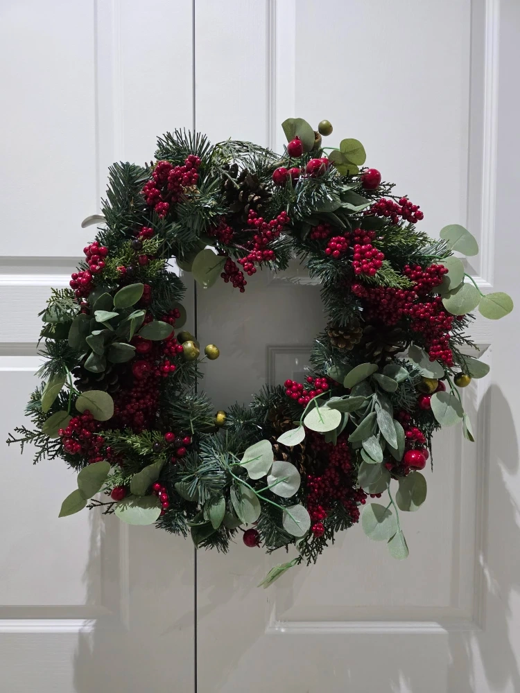 Festive Christmas wreath featuring vibrant red berries and lush green foliage. Perfect for adding a touch of holiday cheer to your front door, table centerpiece, any room in your home!