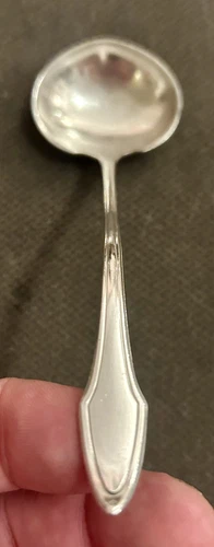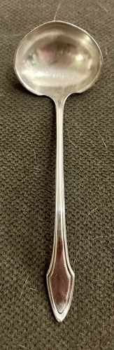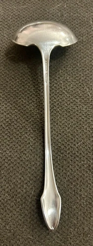 This beautiful cream ladle by Alvin Patent is a must-have for any collector of antique silverware. The ladle features the stunning Molly Stark pattern and is made of high-quality silverplate. It is perfect for serving cream sauces and is sure to add a touch of elegance to any table setting. Estate condition, light scratching in the bowl. Crafted in 1916, this ladle is a prime example of the Arts & Crafts/Mission style that was popular during that time period. It is 5 1/2 inches in length and has been well-maintained, making it a great addition to any collection.