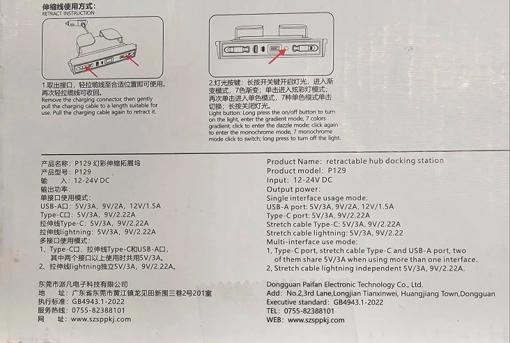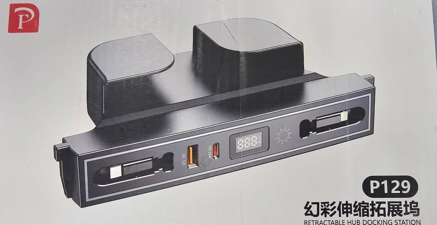 Selling a brand new P129 Retractable Hub Docking Station! It comes in its original box and includes all components. This docking station features multiple ports for versatile use, including USB-A, Type-C, and stretch cable options for both Type-C and Lightning devices. It also has a light button to control different lighting modes. Perfect for keeping your devices charged and organized!