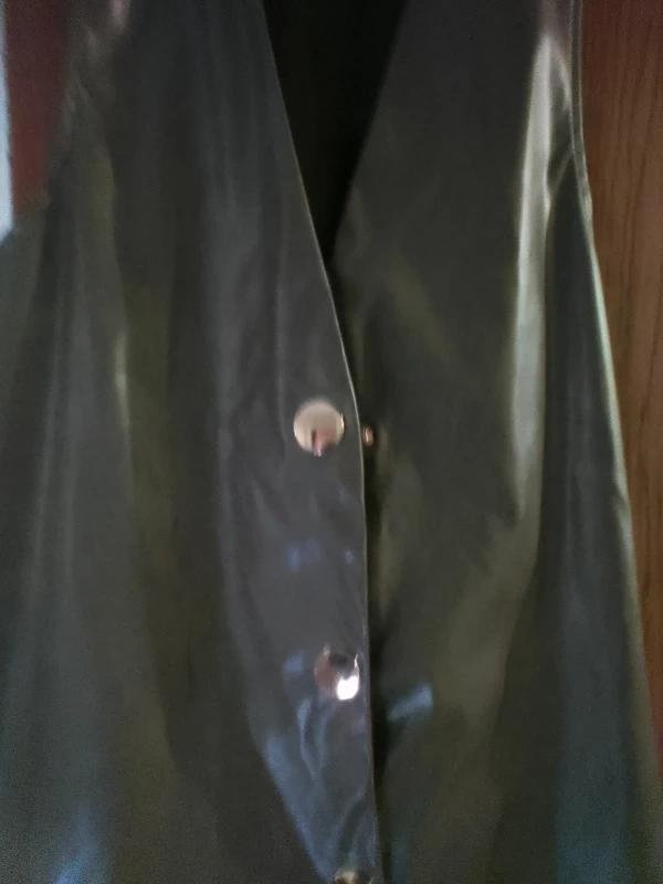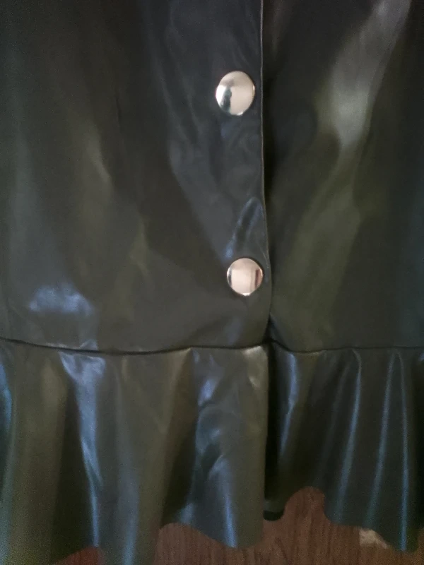 This is an olive green faux leather mini skirt. It features a ruffled hem and button details. Perfect for adding a touch of edgy style to your wardrobe
