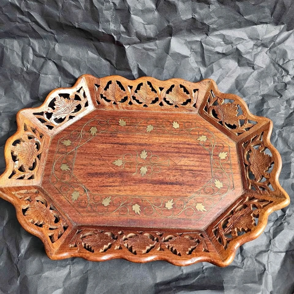 Antique Hand Carved Wood Brass Inlay Tray