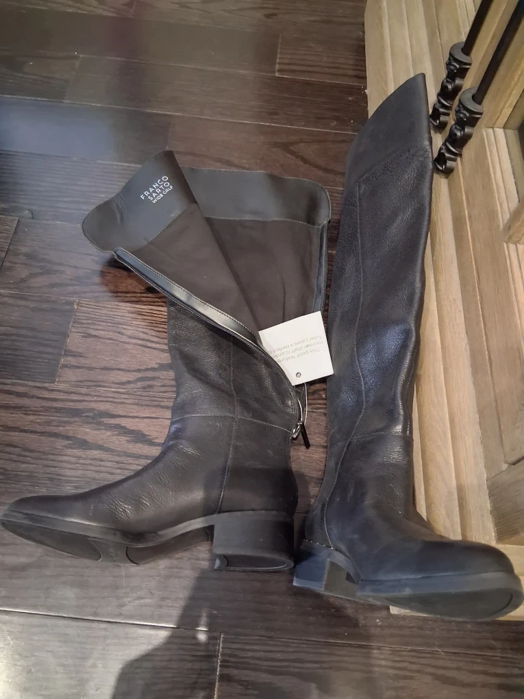 Franco Sarto black leather boots, size 6M with a wide calf. These boots feature a roomier shaft to provide fuller calves a perfect fit.