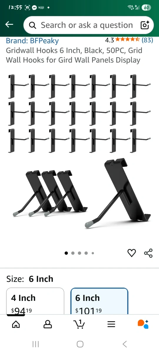Selling a set of BFPeaky gridwall hooks! These are 6-inch black hooks, perfect for organizing or displaying items on grid wall panels. The set includes 50 pieces, so you'll have plenty to work with. They have a maximum weight capacity of 30lbs.