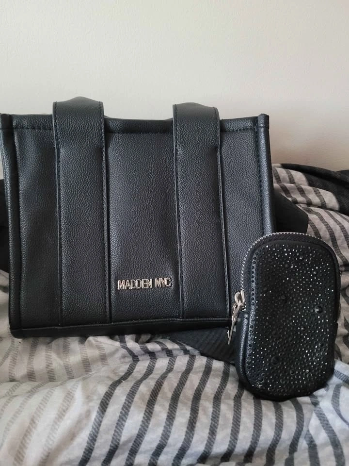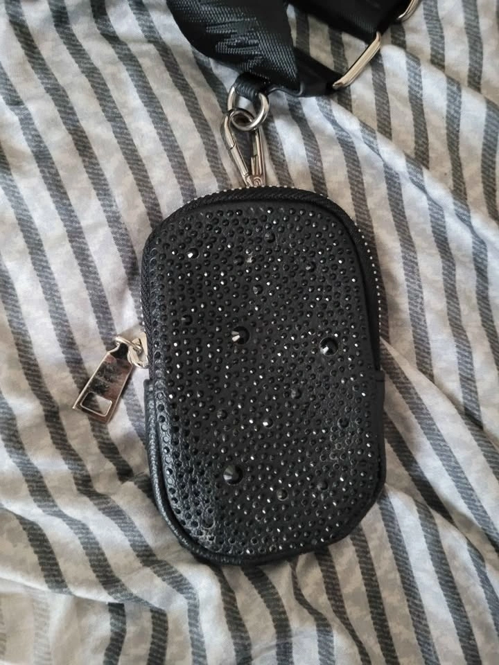 Tiny minimalist bag - open no zipper with pocket inside and zippered pocket inside. Comes with small badazzled wallet purse - fits cards and spare change.