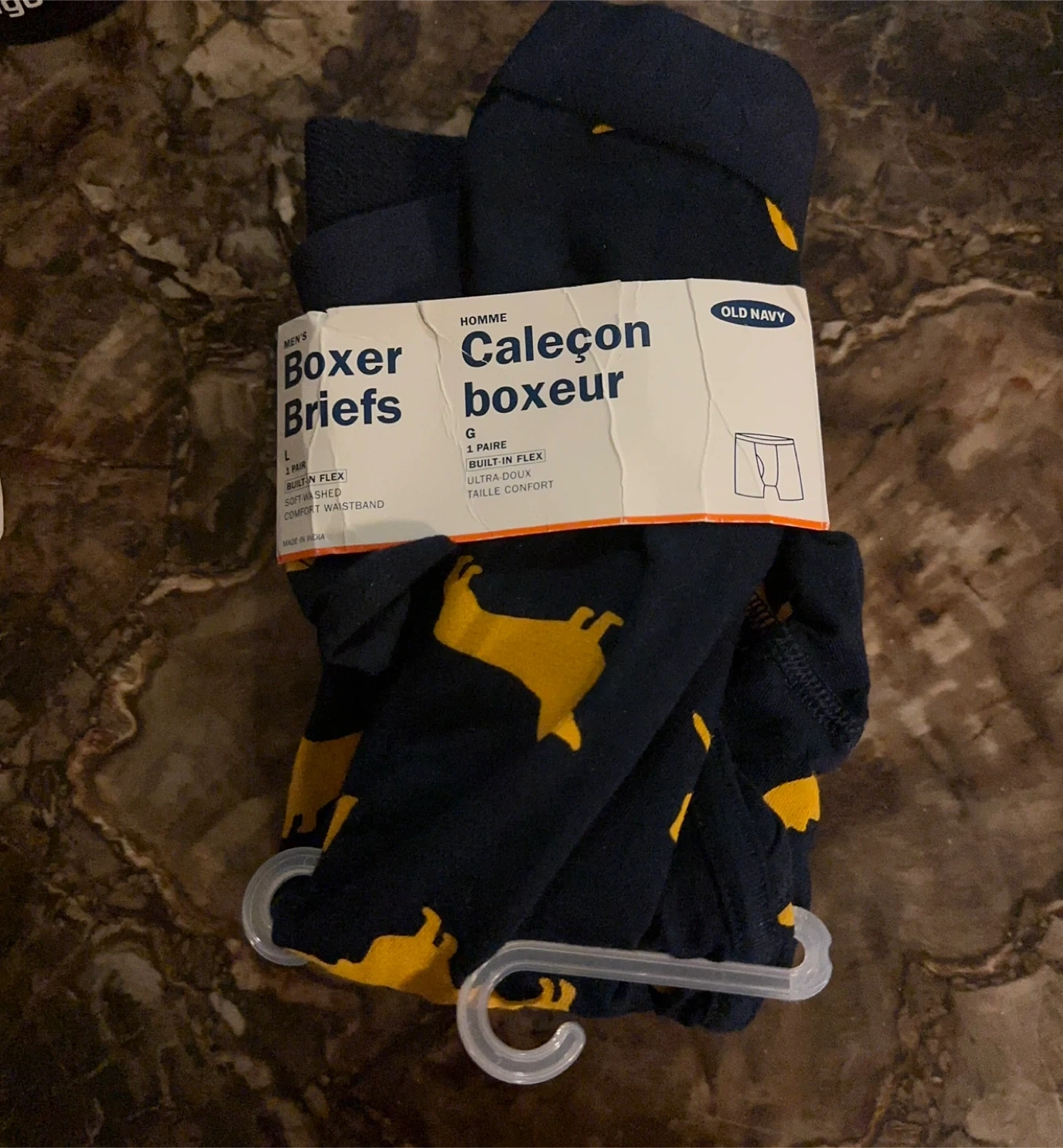 Selling a pack of Old Navy men's boxer briefs in size large. They're navy blue with a fun yellow dog pattern. These are brand new and still in the original packaging. They feature a built-in flex waistband for extra comfort and are made with a soft washed material