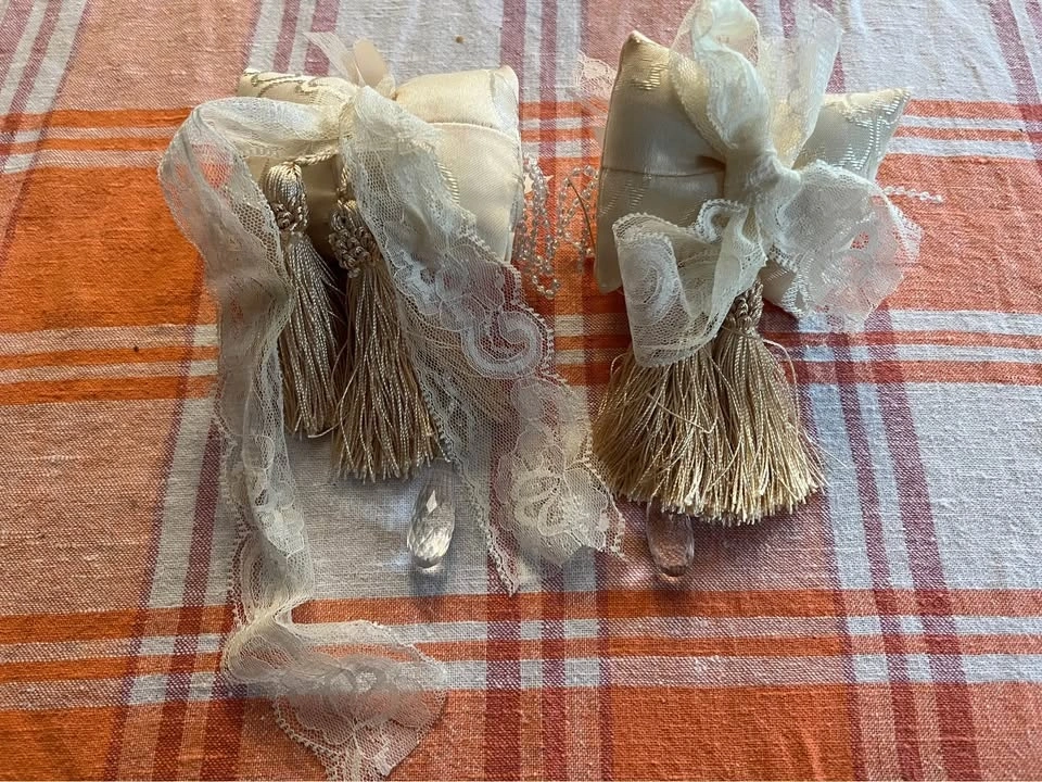 Victorian style decorative pillows. Can be tucked into your tree, or used as curtain tie backs. Lace is sewn into rearside of pillows, to allow for hanging or tying back. Pickup in Courtice.