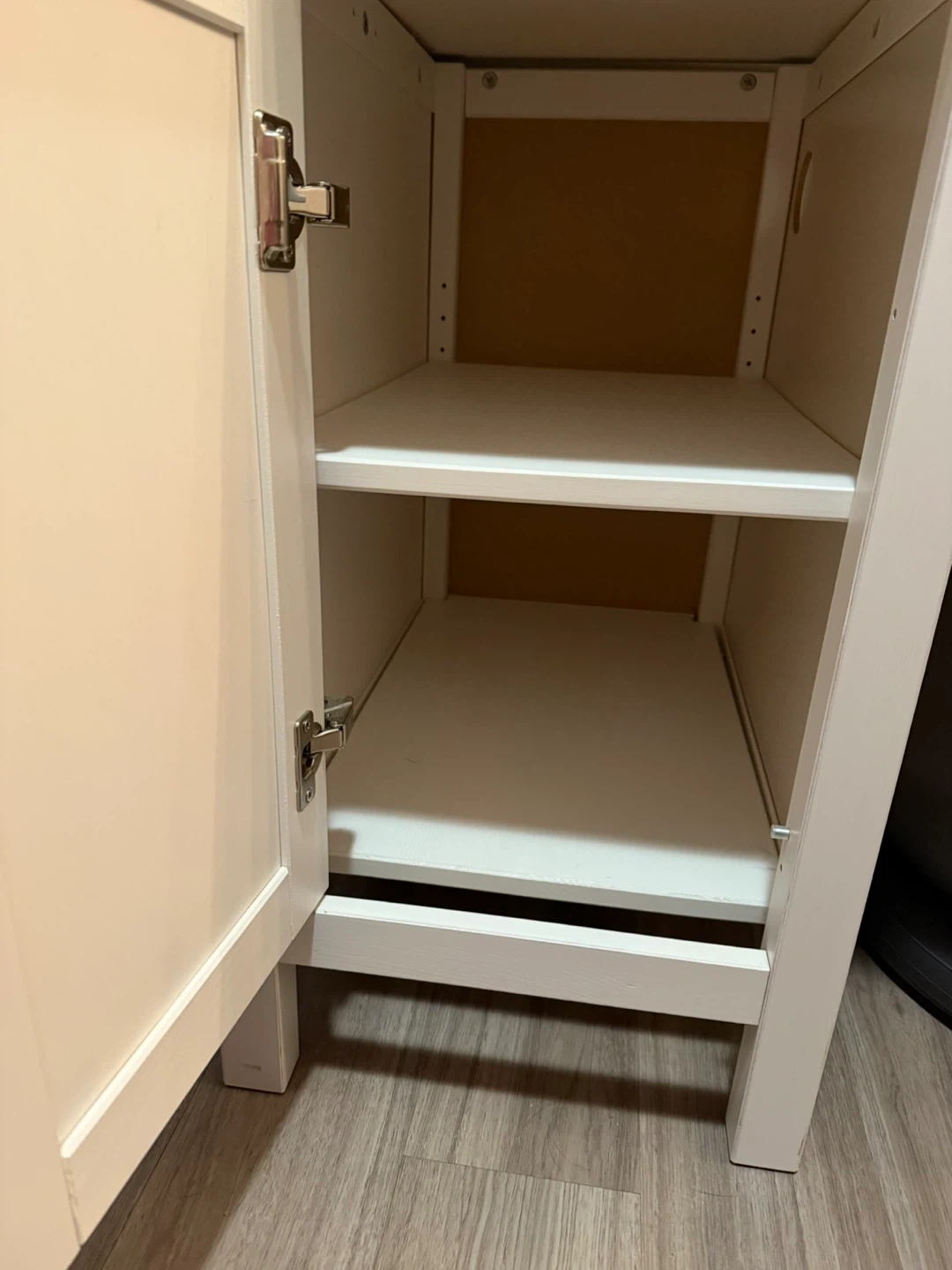 Selling a white desk with built-in storage. It has drawers on the right side and a cabinet with shelves on the left. There is some wear and tear in the drawers, as shown in the photos
