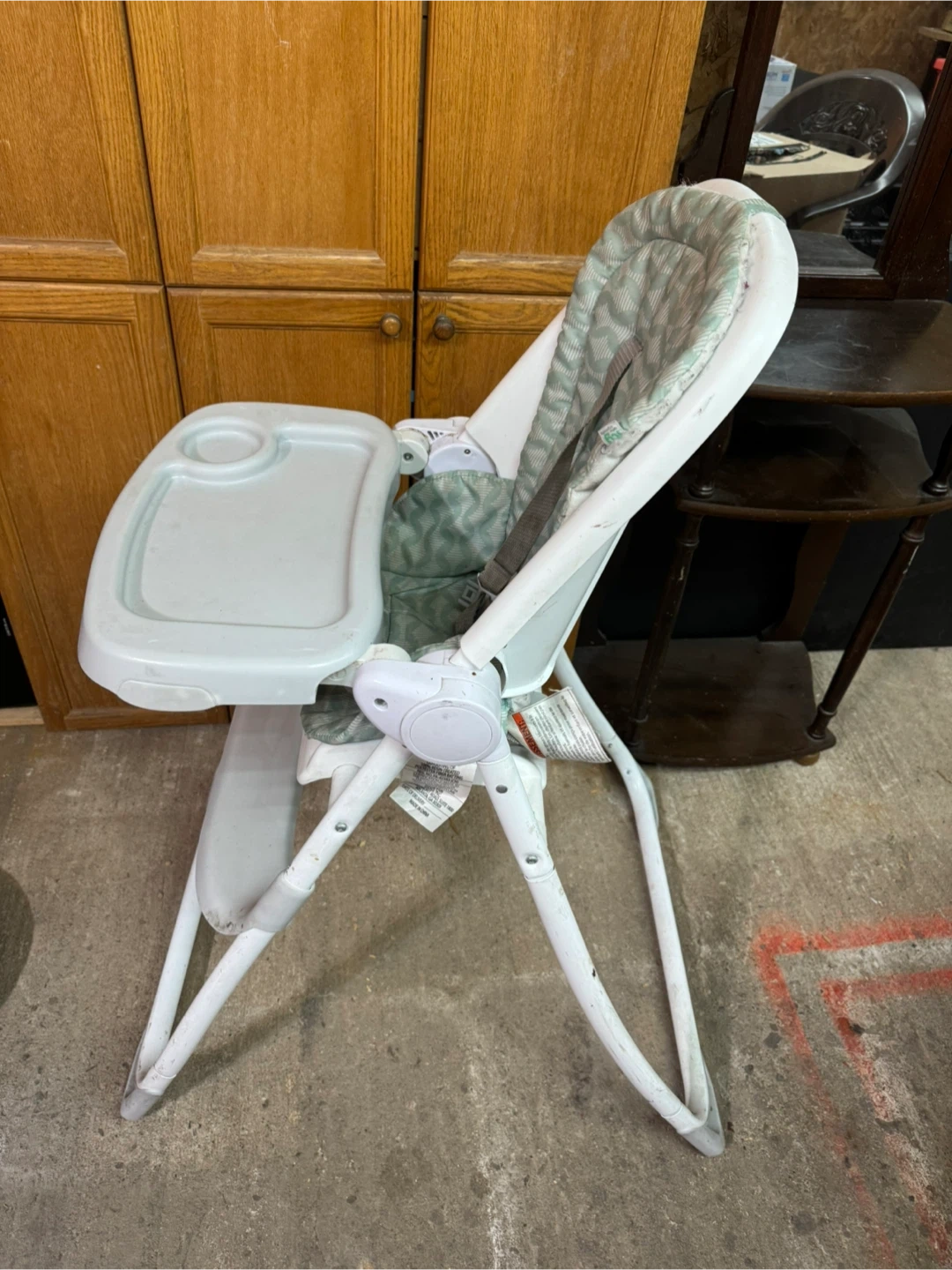 used high chair, perfect for feeding time! It features a removable tray and a comfortable seat pad. The chair is white with a green patterned seat. Ready for a new home!