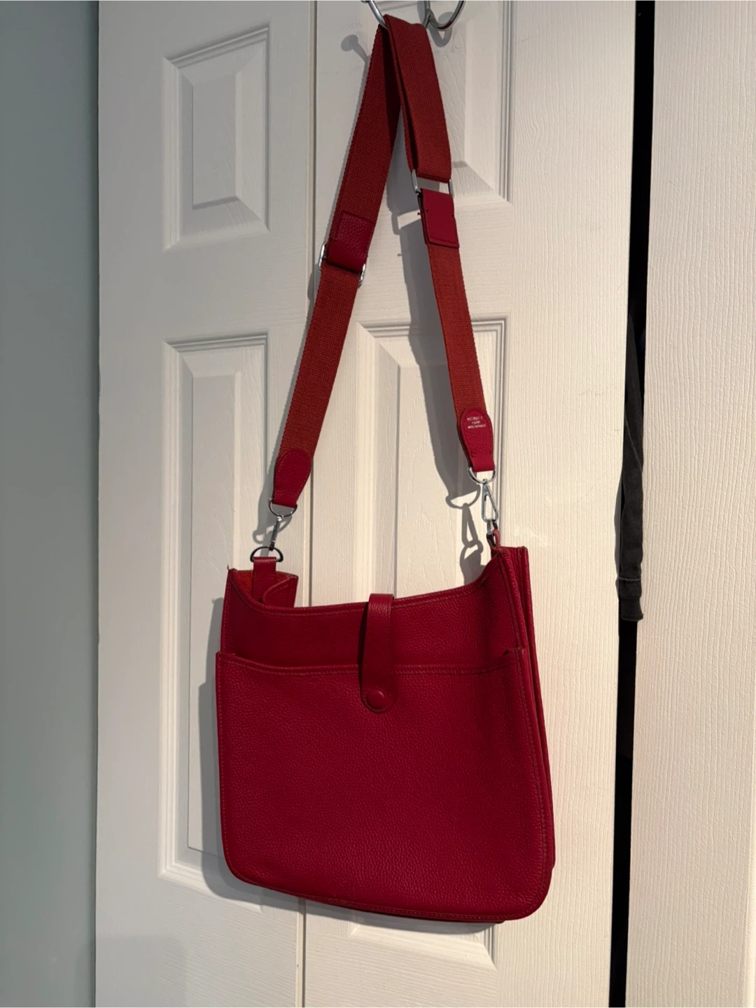 A stylish red shoulder bag! It's in great condition and ready for a new home. The bag features a vibrant red leather exterior and a matching shoulder strap. Perfect for adding a pop of colour to any outfit