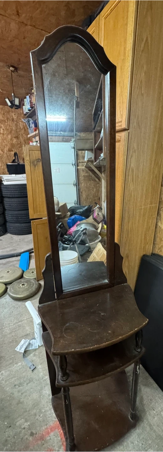 Selling a lovely antique hall stand with a mirror. It's a unique piece perfect for an entryway, room or hallway. It does show some signs of wear consistent with its age, but it adds to its charm! It has a small table and two shelves for storage