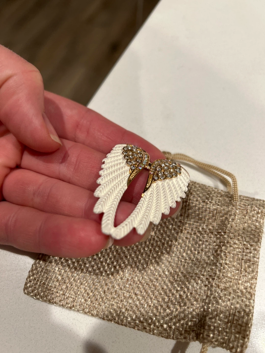 A beautiful angel wings brooch, adorned with sparkling rhinestones! It comes with a small burlap drawstring bag for safekeeping. Perfect for adding a touch of elegance to any outfit or accessory