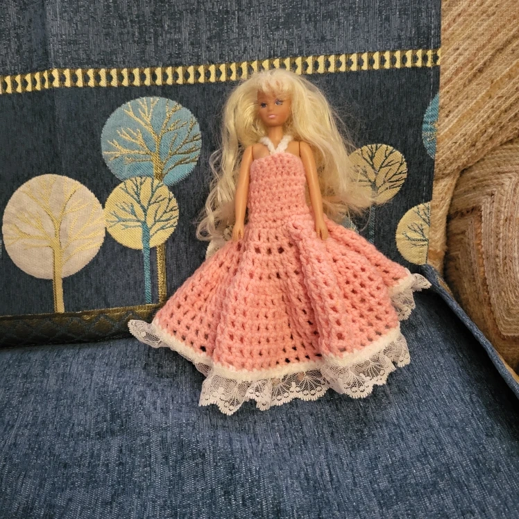 This is a cute, handmade pink crochet doll dress with white lace trim. It's in great condition and would be perfect for a doll collector or for a child to play with